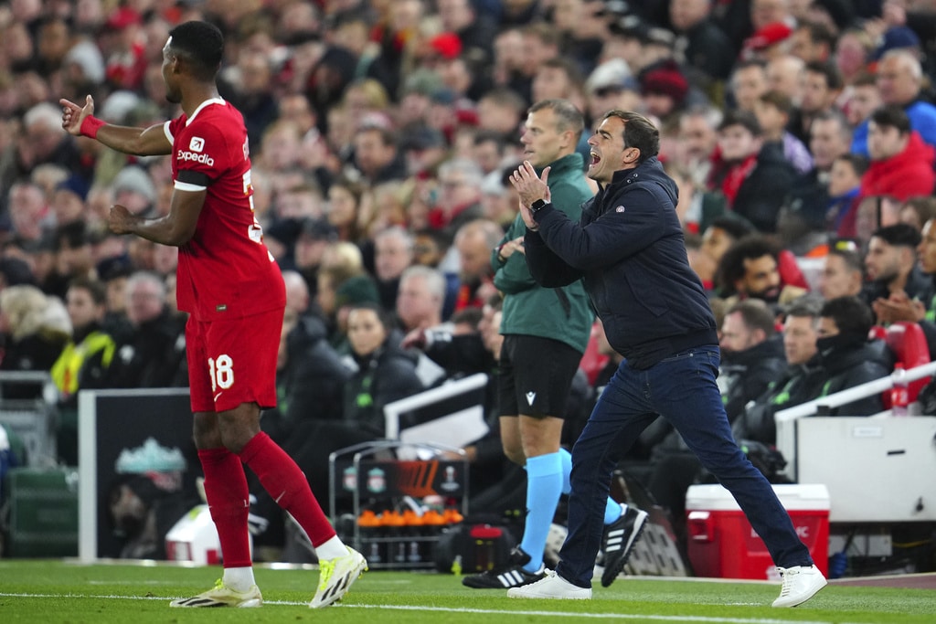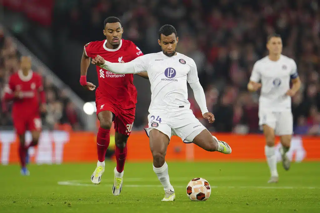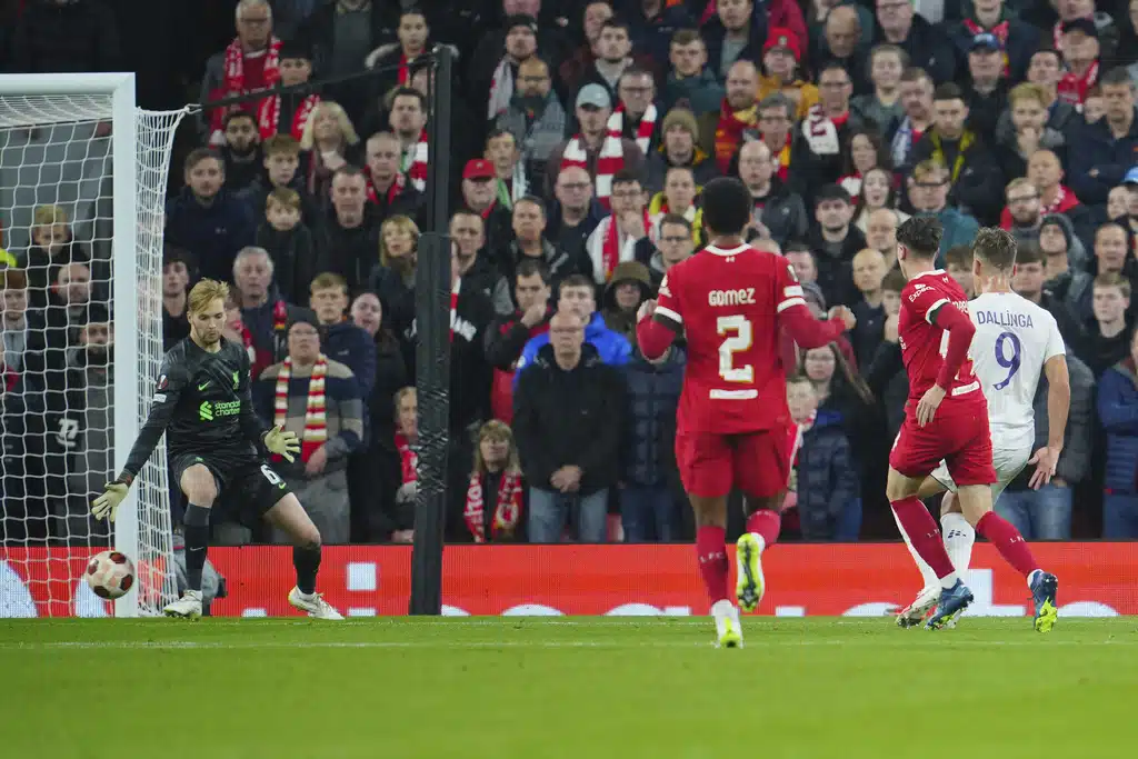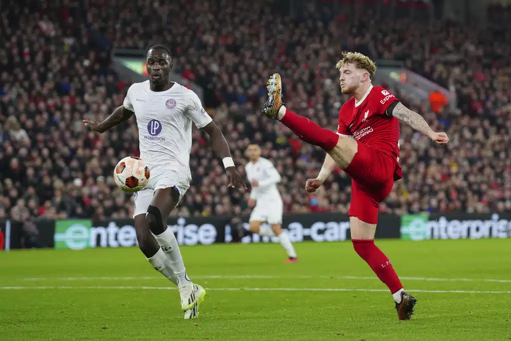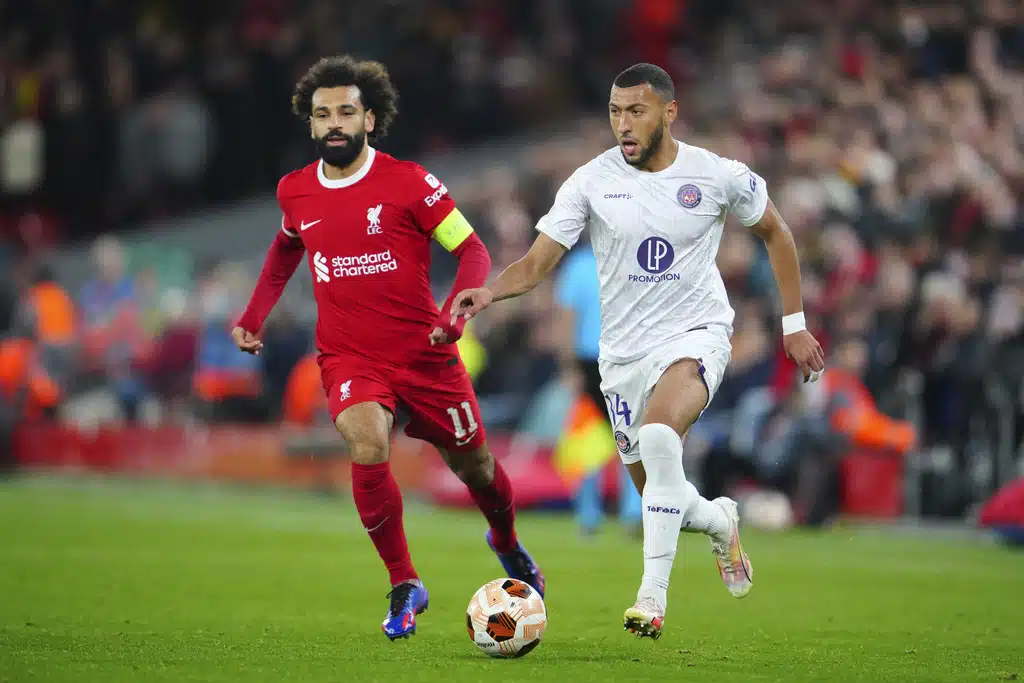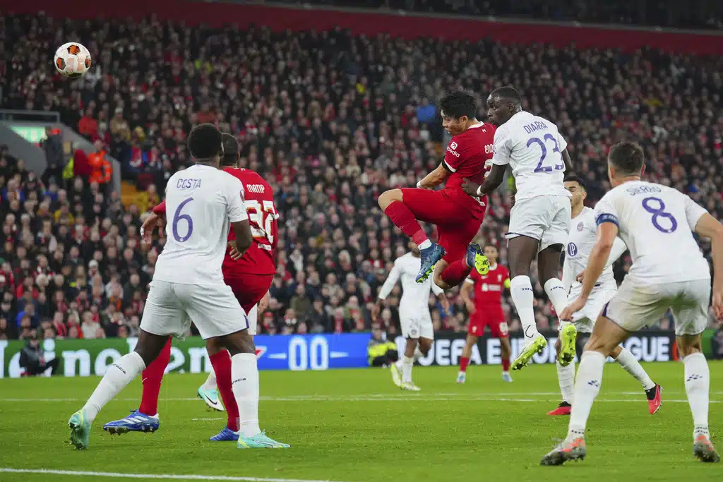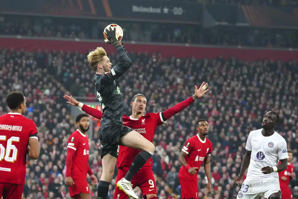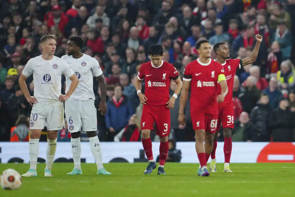 Liverpool starting players pose for a team photo at the beginning of the Europa League Group E soccer match between Liverpool and Toulouse, at Anfield in Liverpool, England, Thursday, Oct. 26, 2023. (AP Photo/Jon Super)Liverpool’s Mohamed Salah, centre, celebrates after scoring his side’s fifth goal during the Europa League Group E soccer match between Liverpool and Toulouse, at Anfield in Liverpool, England, Thursday, Oct. 26, 2023. (AP Photo/Jon Super)Toulouse’s Yanis Begraoui, right, challenges for the ball with Liverpool’s Mohamed Salah during the Europa League Group E soccer match between Liverpool and Toulouse, at Anfield in Liverpool, England, Thursday, Oct. 26, 2023. (AP Photo/Jon Super)Liverpool’s Ryan Gravenberch, right, celebrates after scoring his side’s fourth goal during the Europa League Group E soccer match between Liverpool and Toulouse, at Anfield in Liverpool, England, Thursday, Oct. 26, 2023. (AP Photo/Jon Super)Toulouse’s Cristian Casseres Jr, left, challenges for the ball with Liverpool’s Harvey Elliott during the Europa League Group E soccer match between Liverpool and Toulouse, at Anfield in Liverpool, England, Thursday, Oct. 26, 2023. (AP Photo/Jon Super)Toulouse players react after Liverpool’s Ryan Gravenberch scored his side’s fourth goal during the Europa League Group E soccer match between Liverpool and Toulouse, at Anfield in Liverpool, England, Thursday, Oct. 26, 2023. (AP Photo/Jon Super)Liverpool’s goalkeeper Caoimhin Kelleher makes a save during the Europa League Group E soccer match between Liverpool and Toulouse, at Anfield in Liverpool, England, Thursday, Oct. 26, 2023. (AP Photo/Jon Super)Toulouse’s Mikkel Desler, left, challenges for the ball with Liverpool’s Diogo Jota during the Europa League Group E soccer match between Liverpool and Toulouse, at Anfield in Liverpool, England, Thursday, Oct. 26, 2023. (AP Photo/Jon Super)Toulouse’s head coach Carles Martinez Novell, right, reacts during the Europa League Group E soccer match between Liverpool and Toulouse, at Anfield in Liverpool, England, Thursday, Oct. 26, 2023. (AP Photo/Jon Super)Liverpool’s Harvey Elliott, right, kicks the ball ahead of Toulouse’s Moussa Diarra during the Europa League Group E soccer match between Liverpool and Toulouse, at Anfield in Liverpool, England, Thursday, Oct. 26, 2023. (AP Photo/Jon Super)Liverpool’s Wataru Endo, centre, scores his side’s second goal during the Europa League Group E soccer match between Liverpool and Toulouse, at Anfield in Liverpool, England, Thursday, Oct. 26, 2023. (AP Photo/Jon Super)Toulouse’s Aron Donnum, centre, kicks the ball ahead of Liverpool’s Diogo Jota during the Europa League Group E soccer match between Liverpool and Toulouse, at Anfield in Liverpool, England, Thursday, Oct. 26, 2023. (AP Photo/Jon Super)Toulouse’s Thijs Dallinga, right, scores his side’s opening goal during the Europa League Group E soccer match between Liverpool and Toulouse, at Anfield in Liverpool, England, Thursday, Oct. 26, 2023. (AP Photo/Jon Super)Liverpool’s Trent Alexander-Arnold in action during the Europa League Group E soccer match between Liverpool and Toulouse, at Anfield in Liverpool, England, Thursday, Oct. 26, 2023. (AP Photo/Jon Super)Toulouse’s Cristian Casseres Jr kicks the ball ahead of Liverpool’s Ryan Gravenberch during the Europa League Group E soccer match between Liverpool and Toulouse, at Anfield in Liverpool, England, Thursday, Oct. 26, 2023. (AP Photo/Jon Super)