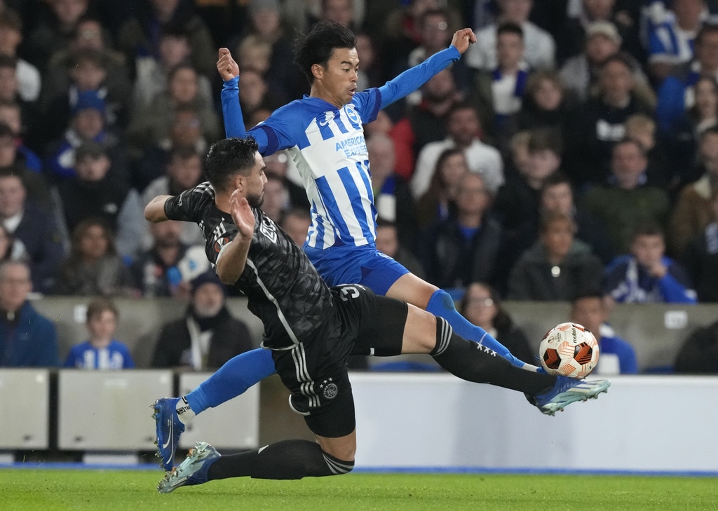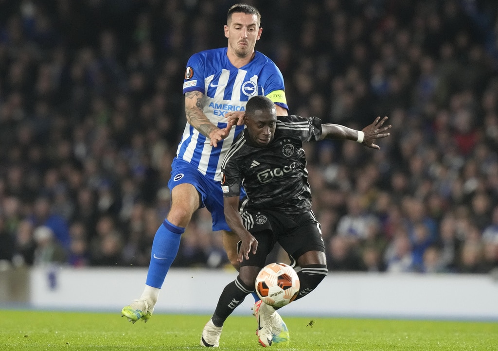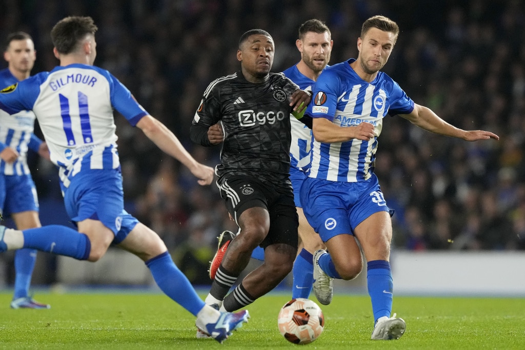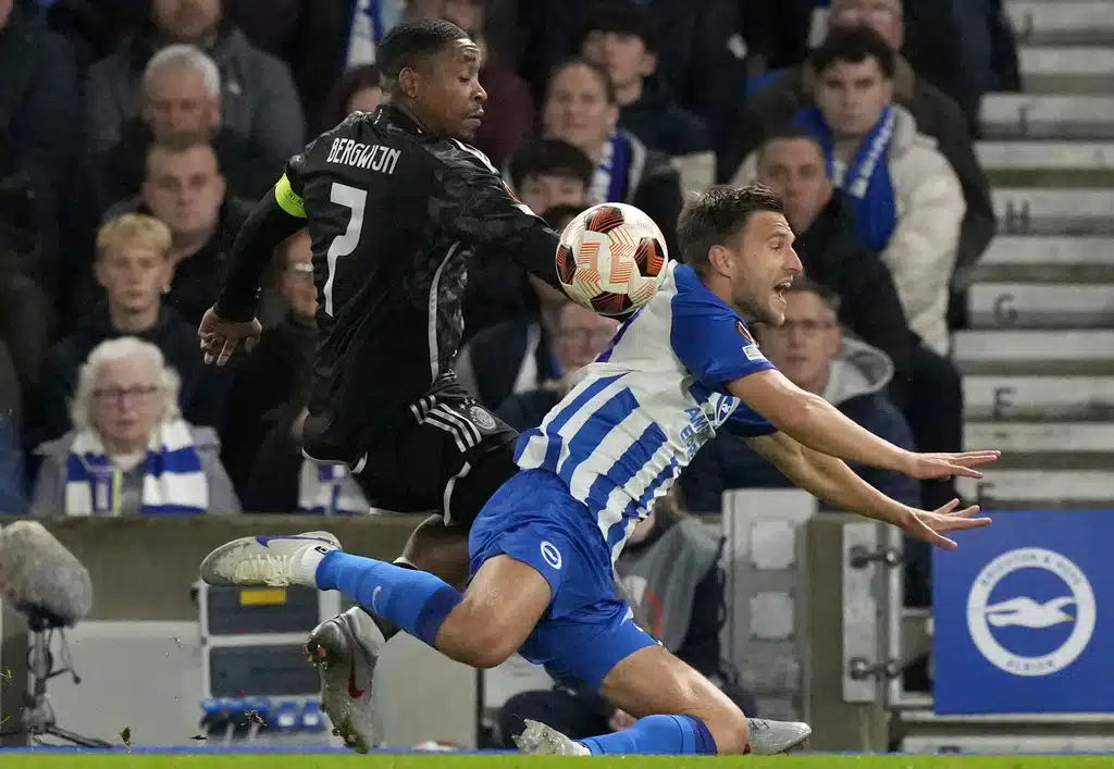 Brighton’s Joel Veltman, right, challenges for the ball with Ajax’s Steven Bergwijn during the Europa League Group B soccer match between Brighton and Hove Albion and Ajax at the Amex stadium in Brighton, England, Thursday, Oct. 26, 2023. (AP Photo/Frank Augstein)Brighton’s Ansu Fati celebrates scoring his sides second goal during the Europa League Group B soccer match between Brighton and Hove Albion and Ajax at the Amex stadium in Brighton, England, Thursday, Oct. 26, 2023. (AP Photo/Frank Augstein)Brighton’s head coach Roberto De Zerbi celebrates at full time as his team win 2-0 in the Europa League Group B soccer match between Brighton and Hove Albion and Ajax at the Amex stadium in Brighton, England, Thursday, Oct. 26, 2023. (AP Photo/Frank Augstein)Brighton’s Pascal Gross celebrates at full time as his team win 2-0 in the Europa League Group B soccer match between Brighton and Hove Albion and Ajax at the Amex stadium in Brighton, England, Thursday, Oct. 26, 2023. (AP Photo/Frank Augstein)Brighton’s Pascal Gross celebrates at full time as his team win 2-0 in the Europa League Group B soccer match between Brighton and Hove Albion and Ajax at the Amex stadium in Brighton, England, Thursday, Oct. 26, 2023. (AP Photo/Frank Augstein)Brighton’s Ansu Fati celebrates scoring his sides second goal during the Europa League Group B soccer match between Brighton and Hove Albion and Ajax at the Amex stadium in Brighton, England, Thursday, Oct. 26, 2023. (AP Photo/Frank Augstein)Brighton’s Ansu Fati, right, celebrates scoring his sides second goal during the Europa League Group B soccer match between Brighton and Hove Albion and Ajax at the Amex stadium in Brighton, England, Thursday, Oct. 26, 2023. (AP Photo/Frank Augstein)Brighton’s Kaoru Mitoma competes for the ball with Ajax’s Josip Sutalo during the Europa League Group B soccer match between Brighton and Hove Albion and Ajax at the Amex stadium in Brighton, England, Thursday, Oct. 26, 2023. (AP Photo/Frank Augstein)during the Europa League Group B soccer match between Brighton and Hove Albion and Ajax at the Amex stadium in Brighton, England, Thursday, Oct. 26, 2023. (AP Photo/Frank Augstein)Brighton players celebrate after Brighton’s Joao Pedro scores his sides first goal during the Europa League Group B soccer match between Brighton and Hove Albion and Ajax at the Amex stadium in Brighton, England, Thursday, Oct. 26, 2023. (AP Photo/Frank Augstein)Brighton’s Lewis Dunk, left, competes for the ball with Ajax’s Carlos Forbs during the Europa League Group B soccer match between Brighton and Hove Albion and Ajax at the Amex stadium in Brighton, England, Thursday, Oct. 26, 2023. (AP Photo/Frank Augstein)Ajax’s goalkeeper Diant Ramaj makes a save from a shot by Brighton’s Ansu Fati during the Europa League Group B soccer match between Brighton and Hove Albion and Ajax at the Amex stadium in Brighton, England, Thursday, Oct. 26, 2023. (AP Photo/Frank Augstein)Brighton’s Joel Veltman, right, challenges for the ball with Ajax’s Steven Bergwijn during the Europa League Group B soccer match between Brighton and Hove Albion and Ajax at the Amex stadium in Brighton, England, Thursday, Oct. 26, 2023. (AP Photo/Frank Augstein)