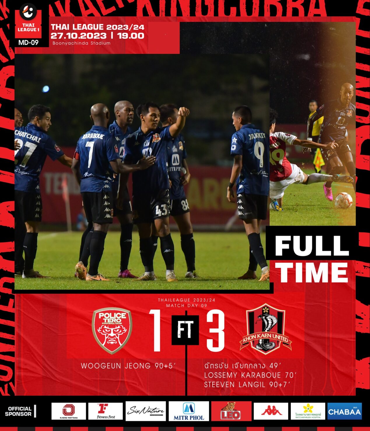 ผลการแข่งขันปรากฏว่า ทีมเยือนได้ 3 ประสาน แนวรุก ฉัตรชัย เจียกกลาง, ลอสเซมี่ คาราบูเอ้ และ สตีเฟ่น ลองจิล ซัดคนเม็ด ช่วย “จงอางผยอง” ขอนแก่น ยูไนเต็ด บุกดับซ่า “มังกรโล่ห์เงิน” โปลิศ เทโร เอฟซี ไปได้ 3-1 ประเดิมการคุมทีมของกุนซือใหม่ “เอกลักษณ์ ทองอ่ำ” ที่เข้ามาคุมเป็นเกมแรกได้อีกด้วย โดย ขอนแก่น ยูไนเต็ด มี 9 แต้ม ส่วน โปลิศ เทโร เอฟซี มี 11 แต้มตามเดิม ในศึกไทยลีก นัดที่ 9 ประจำวันศุกร์ที่ 27 ตุลาคม 2566