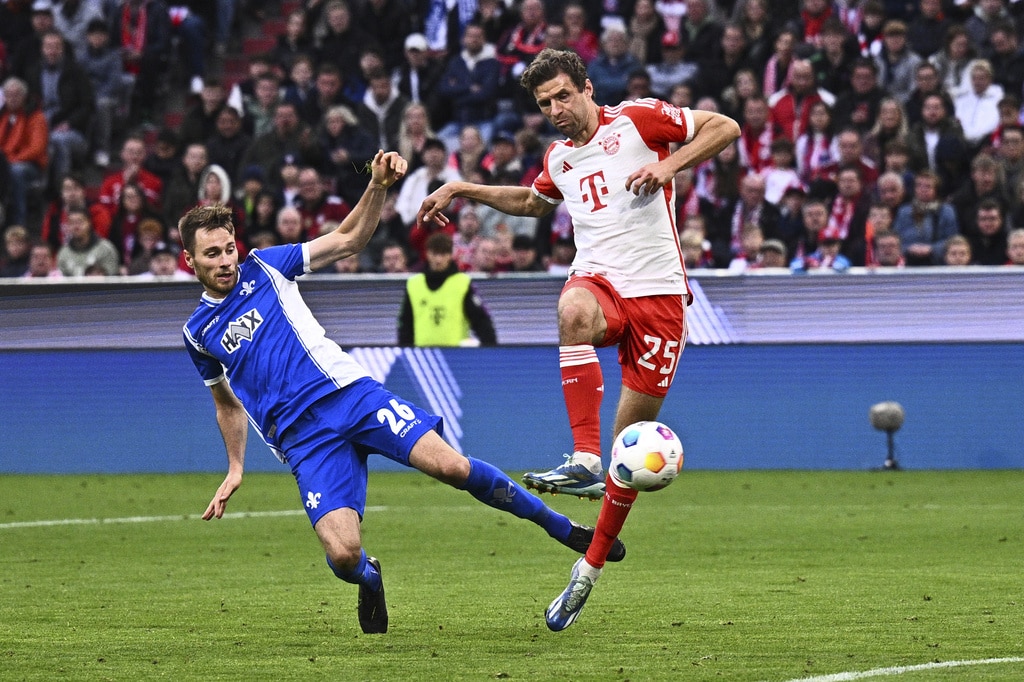 Bayern’s Thomas Mueller celebrates scoring his side’s sixth goal during the German Bundesliga soccer match between Bayern Munich and SV Darmstadt 98 at the Allianz Arena in Munich, Germany, Saturday, Oct. 28, 2023. (Tom Weller/dpa via AP)
