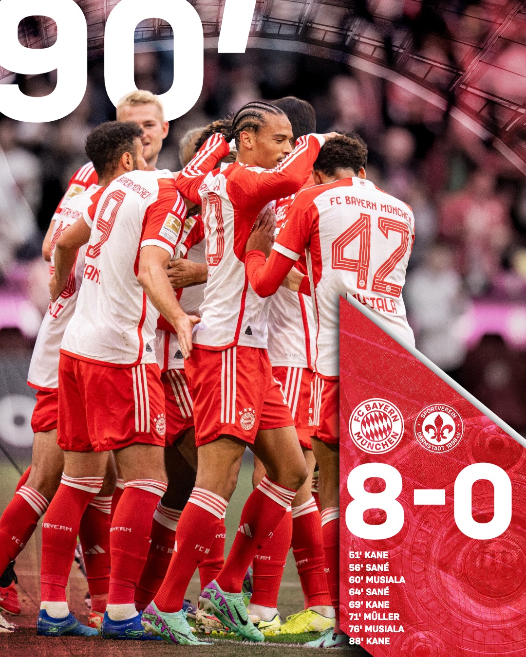 Bayner’s Alphonso Davies and Matthias Bader of Darmstadt 98, right, vie for the ball during the German Bundesliga soccer match between Bayern Munich and SV Darmstadt 98 at the Allianz Arena in Munich, Germany, Saturday, Oct. 28, 2023. (Tom Weller/dpa via AP)Bayern’s Harry Kane scores his side’s eight goal during the German Bundesliga soccer match between Bayern Munich and SV Darmstadt 98 at the Allianz Arena in Munich, Germany, Saturday, Oct. 28, 2023. (Tom Weller/dpa via AP)Bayern’s Leroy Sane scores his side’s seventh goal during the German Bundesliga soccer match between Bayern Munich and SV Darmstadt 98 at the Allianz Arena in Munich, Germany, Saturday, Oct. 28, 2023. (Tom Weller/dpa via AP)Bayern’s Thomas Mueller scores his side’s sixth goal during the German Bundesliga soccer match between Bayern Munich and SV Darmstadt 98 at the Allianz Arena in Munich, Germany, Saturday, Oct. 28, 2023. (Tom Weller/dpa via AP)Bayern’s Harry Kane scores his side’s fifth goal during the German Bundesliga soccer match between Bayern Munich and SV Darmstadt 98 at the Allianz Arena in Munich, Germany, Saturday, Oct. 28, 2023. (Tom Weller/dpa via AP)Bayern’s Leroy Sane scores during the German Bundesliga soccer match between Bayern Munich and SV Darmstadt 98 at the Allianz Arena in Munich, Germany, Saturday, Oct. 28, 2023. (Tom Weller/dpa via AP)Bayern’s Leroy Sane scores his side’s second goal during the German Bundesliga soccer match between Bayern Munich and SV Darmstadt 98 at the Allianz Arena in Munich, Germany, Saturday, Oct. 28, 2023. (Tom Weller/dpa via AP)Bayern’s Harry Kane, right, celebrates with teammate Noussair Mazraoui after scoring during the German Bundesliga soccer match between Bayern Munich and SV Darmstadt 98 at the Allianz Arena in Munich, Germany, Saturday, Oct. 28, 2023. (Tom Weller/dpa via AP)Bayern’s Harry Kane celebrates after scoring during the German Bundesliga soccer match between Bayern Munich and SV Darmstadt 98 at the Allianz Arena in Munich, Germany, Saturday, Oct. 28, 2023. (Tom Weller/dpa via AP)Noussair Mazraoui of Bayern and Tim Skarke of Darmstadt 98, left, compete for the ball during the German Bundesliga soccer match between Bayern Munich and SV Darmstadt 98 at the Allianz Arena in Munich, Germany, Saturday, Oct. 28, 2023. (Tom Weller/dpa via AP)Bayern goalkeeper Manuel Neue reacts during the German Bundesliga soccer match between Bayern Munich and SV Darmstadt 98 at the Allianz Arena in Munich, Germany, Saturday, Oct. 28, 2023. (Tom Weller/dpa via AP)Matthias Bader of Darmstadt 98, left, and Alphonso Davies of Bayern vie for the ball during the German Bundesliga soccer match between Bayern Munich and SV Darmstadt 98 at the Allianz Arena in Munich, Germany, Saturday, Oct. 28, 2023. (Tom Weller/dpa via AP)Joshua Kimmich of Bayern Munich, right, fouls Marvin Mehlem of Darmstadt 98 during the German Bundesliga soccer match between Bayern Munich and SV Darmstadt 98 at the Allianz Arena in Munich, Germany, Saturday, Oct. 28, 2023. (Tom Weller/dpa via AP)