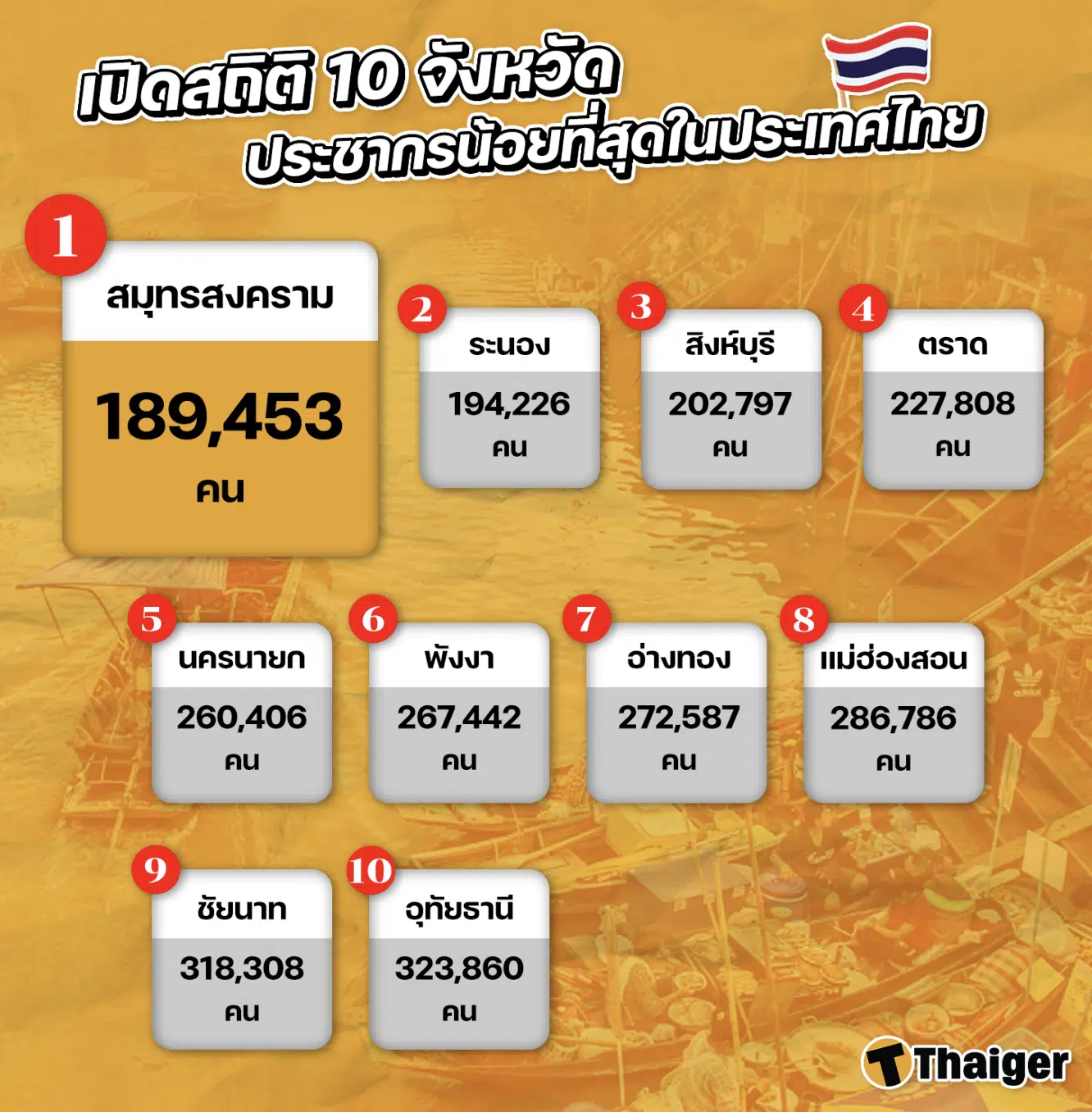สำรวจจังหวัดที่มีจำนวนประชากรน้อยที่สุดในประเทศไทย 10 อันดับแรก จังหวัดที่น้อยสุดมีประชากรไม่ถึงสองแสนคน พบส่วนใหญ่เป็นภาคกลาง