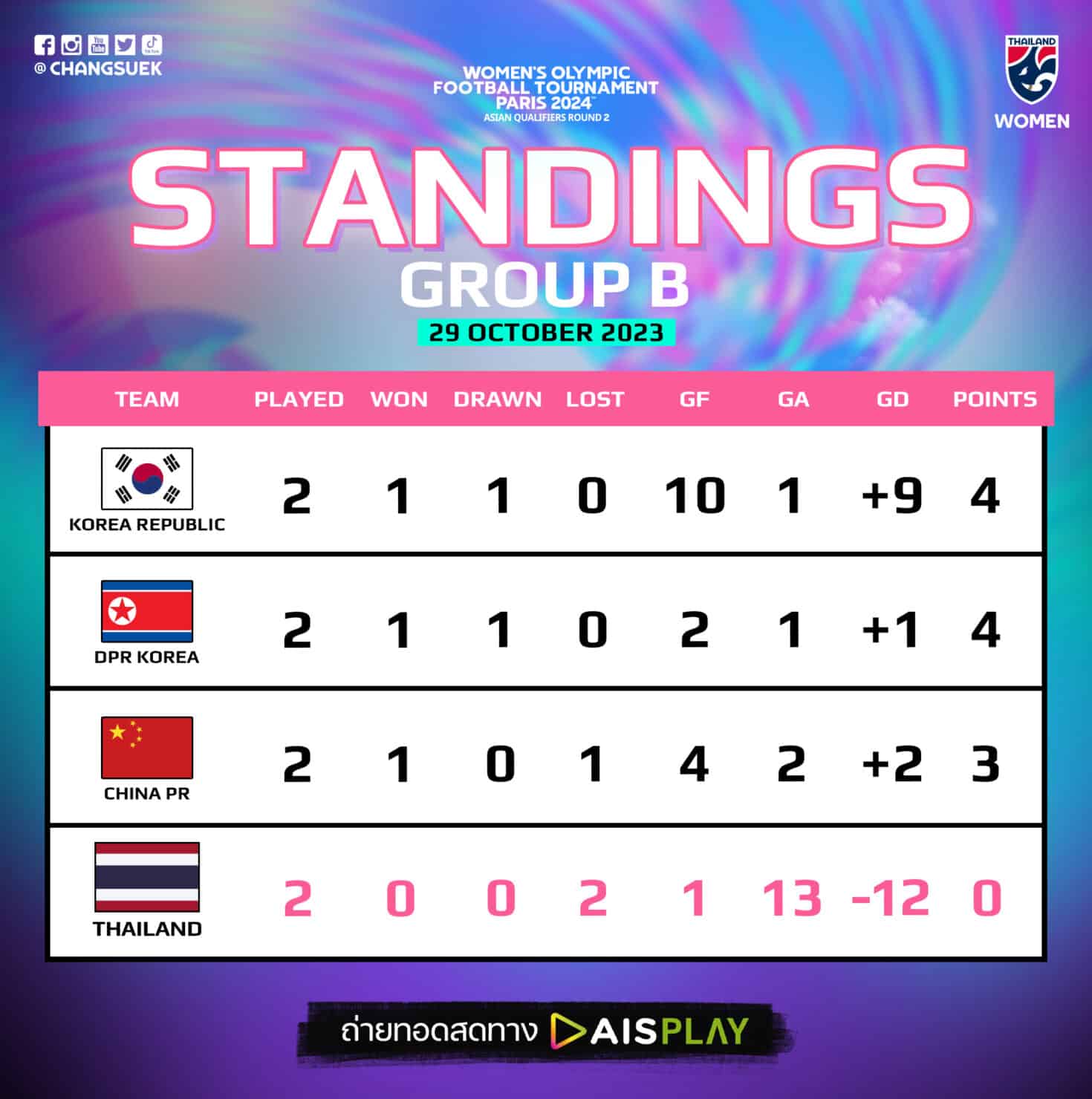 สรุปตารางคะแนน ฟุตบอลหญิง โอลิมปิก รอบคัดเลือก โซนเอเชีย รอบ 2 กลุ่มบี หลังจบการแข่งขันนัดที่สอง
