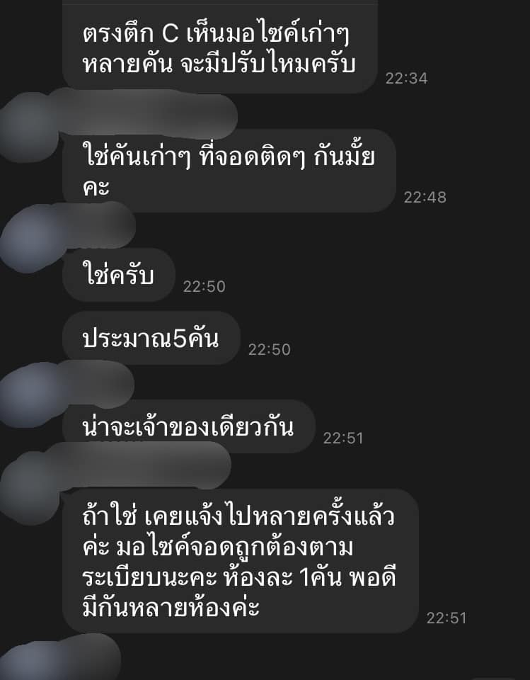 โดยลูกบ้านร้องฝ่ายนิติระบุว่า เห็นมอไซค์เก่าๆหลายคันมาจอดติดกัน พร้อมระบุด้วยว่าเคยแจ้งไปแล้วหลายครั้ง ย้ำว่าต้องถูกต้องตามระเบียบห้องละ 1 คัน
