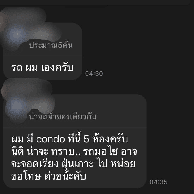 ก่อนที่เจ้าของจะมาแสดงตัวและระบุว่าทั้ง 5 คันนั้นเป็นของตนเอง พร้อมระบุด้วยว่าเขามี 5 ห้อง ดังนั้นแล้วเขาไม่ได้ทำผิดกฎ 1 ห้อง 1 คัน ทางนิติคอนโดก็ทราบ แต่ก็ขออภัยด้วยที่รถอาจจะฝุ่นเกาะไปหน่อย งานนี้ทำเอาไลน์กลุ่มถึงกับเงียบกริบ