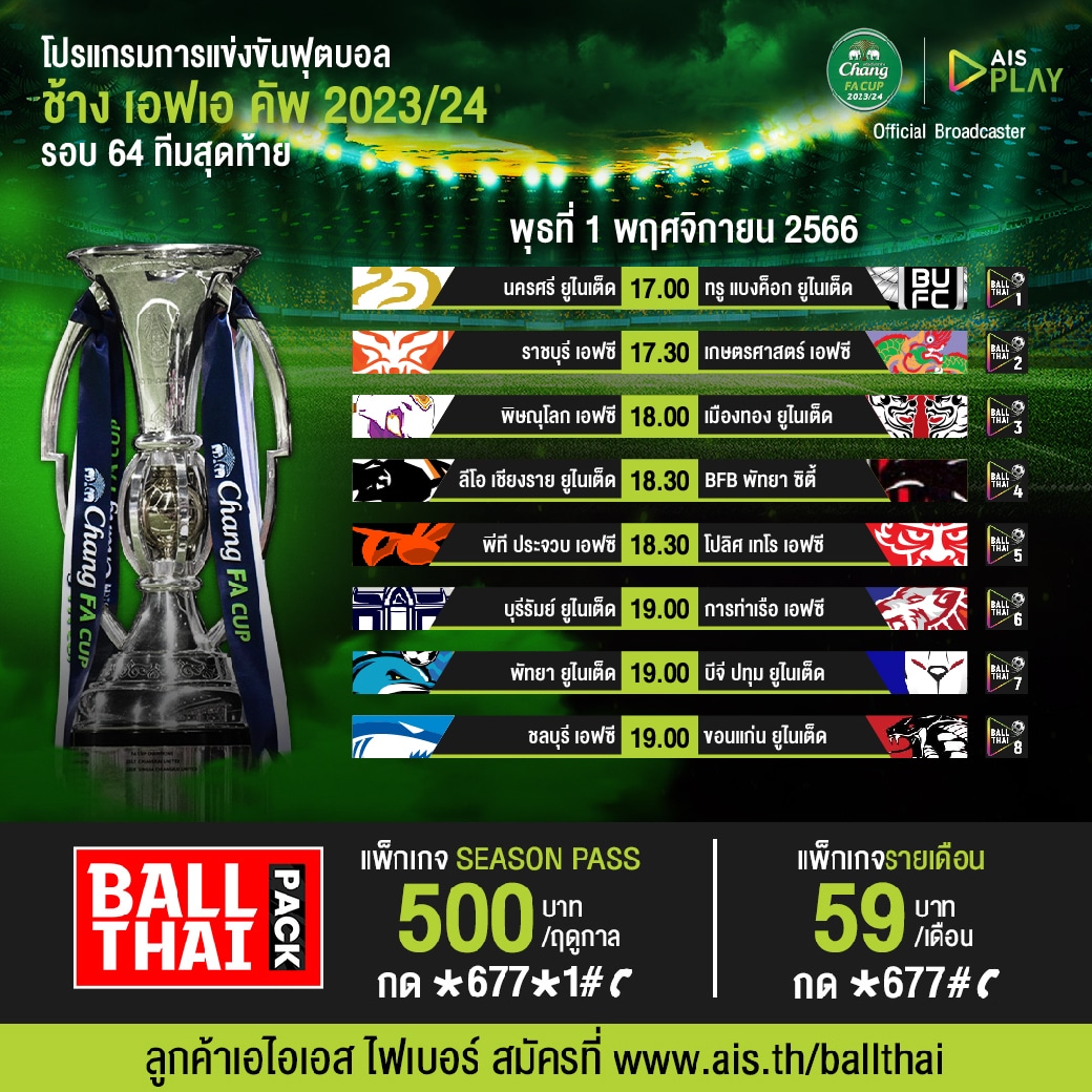 โปรแกรม ช้าง เอฟเอคัพ ฤดูกาล 2023/24 รอบ 64 ทีมสุดท้าย วันพุธที่ 1 พฤศจิกายน 2566 นี้