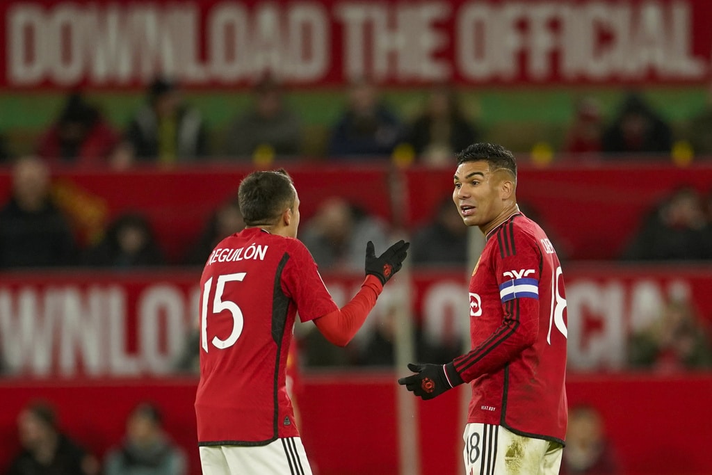 Manchester United’s Bruno Fernandes, right, and Manchester United’s Sofyan Amrabat react at the end of EFL Cup fourth round soccer match between Manchester United and Newcastle at Old Trafford stadium in Manchester, England, Wednesday, Nov. 1, 2023. (AP Photo/Dave Thompson)