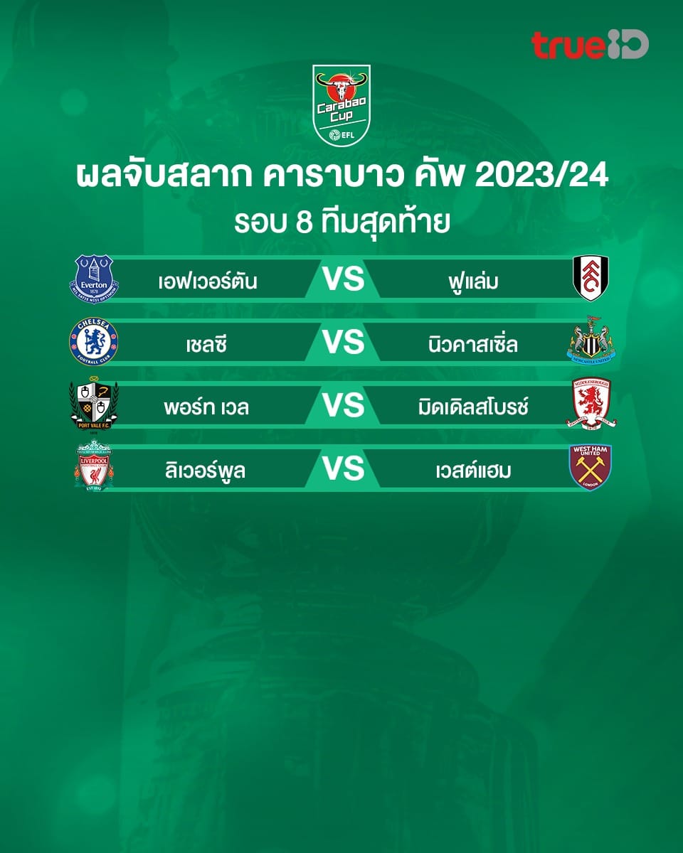 สรุป ผลการจับสลาก ประกบคู่ฟุตบอล คาราบาวคัพ 2023/24 รอบ 5 หรือ รอบ 8 ทีมสุดท้าย