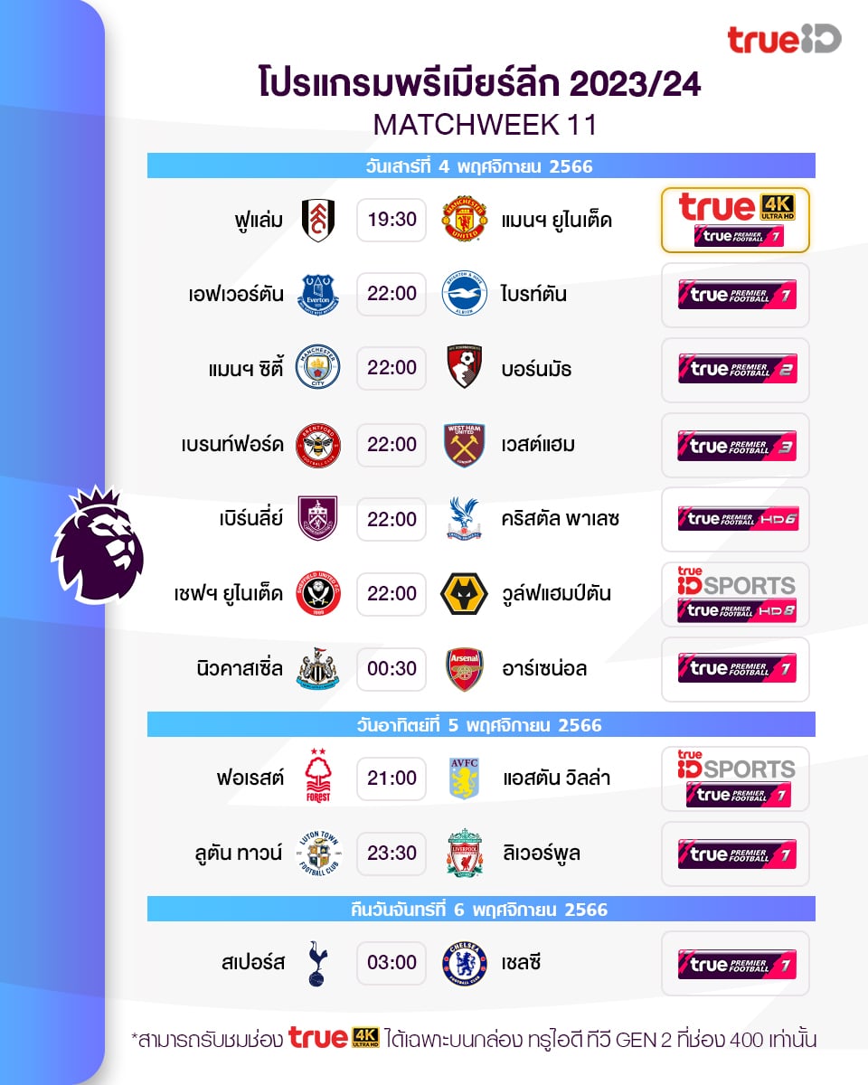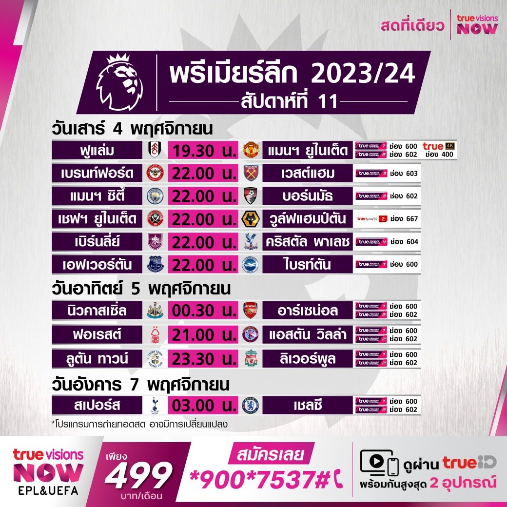 โปรแกรม พรีเมียร์ลีก ประจำฤดูกาล 2023/24 สัปดาห์ที่ 11 ของฤดูกาล