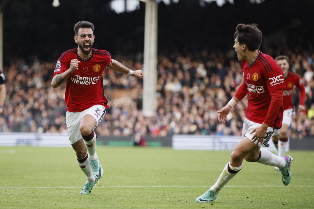 Manchester United’s Bruno Fernandes, right, celebrates after scoring his side’s opening goal during the English Premier League soccer match between Fulham and Manchester United, at Craven Cottage, London, Saturday, Nov. 4, 2023. (AP Photo/David Cliff)
