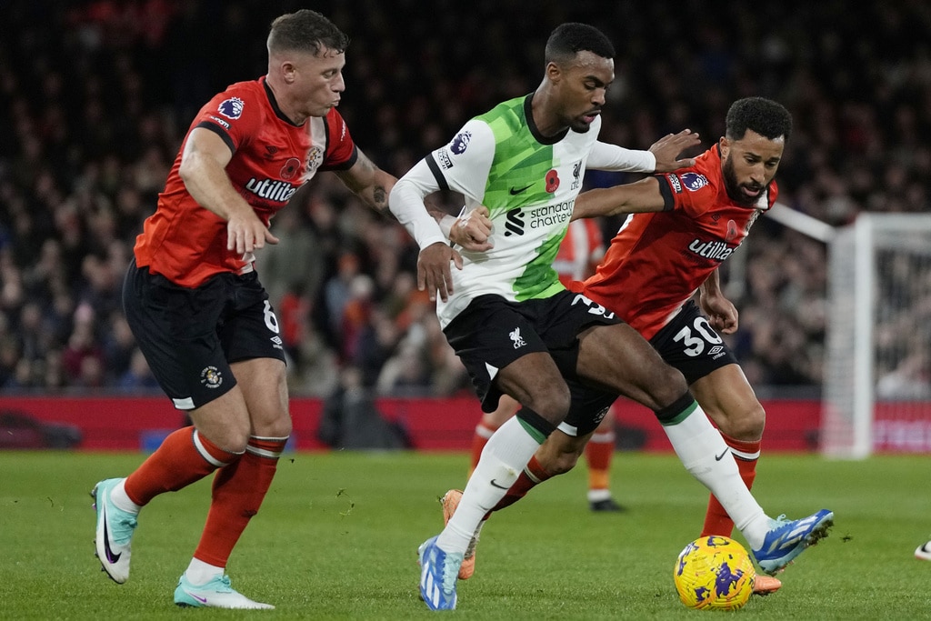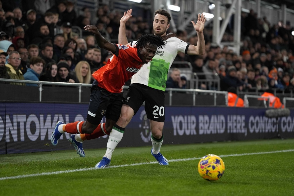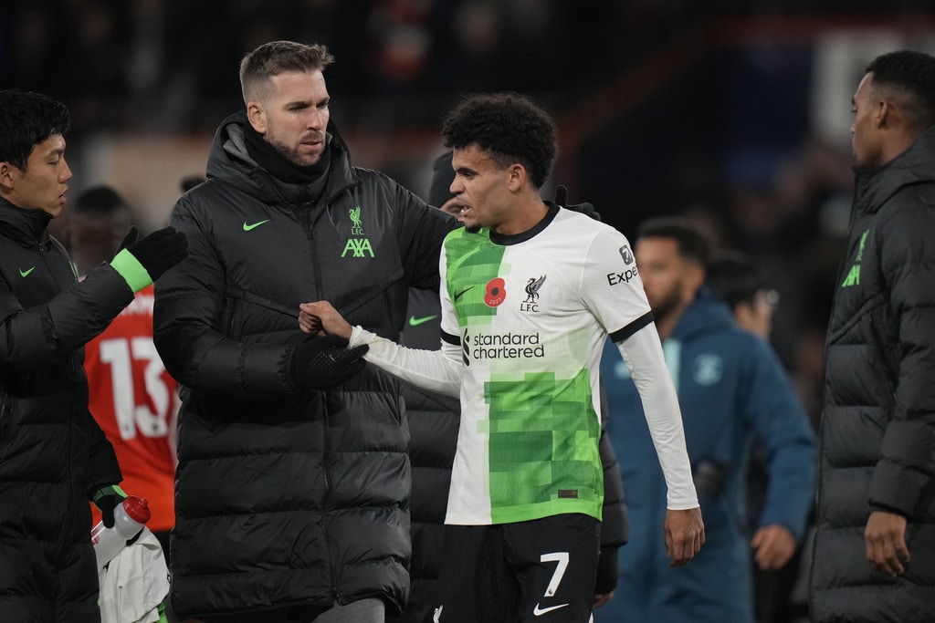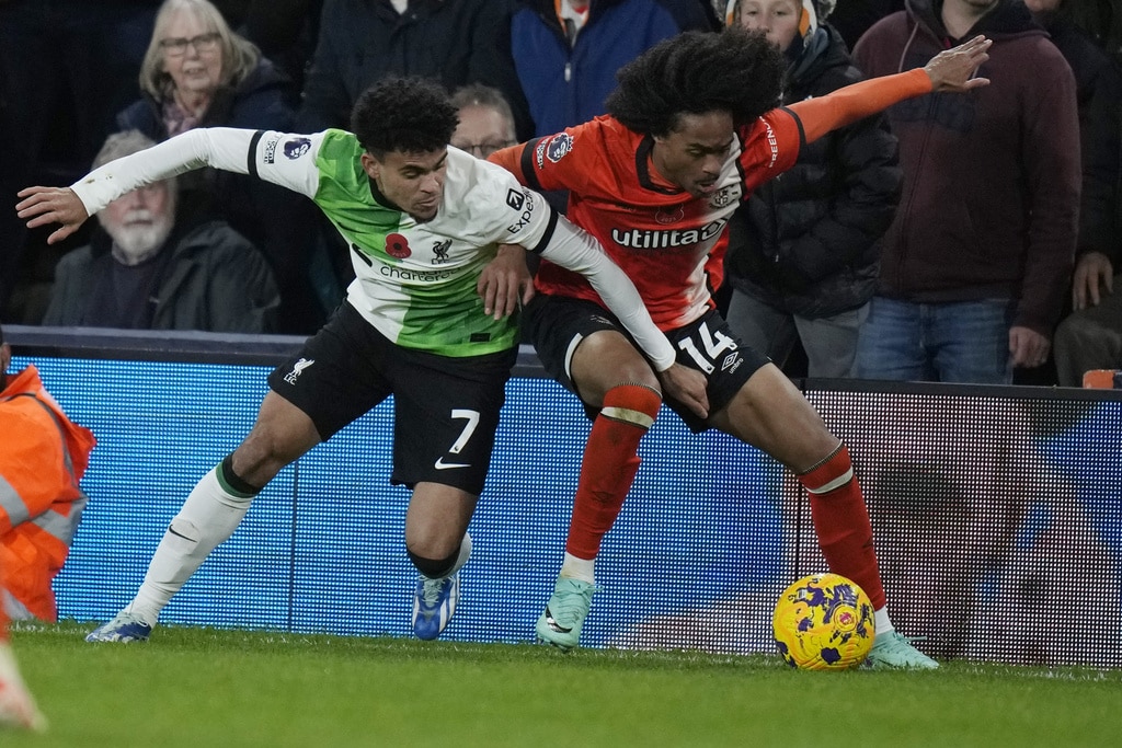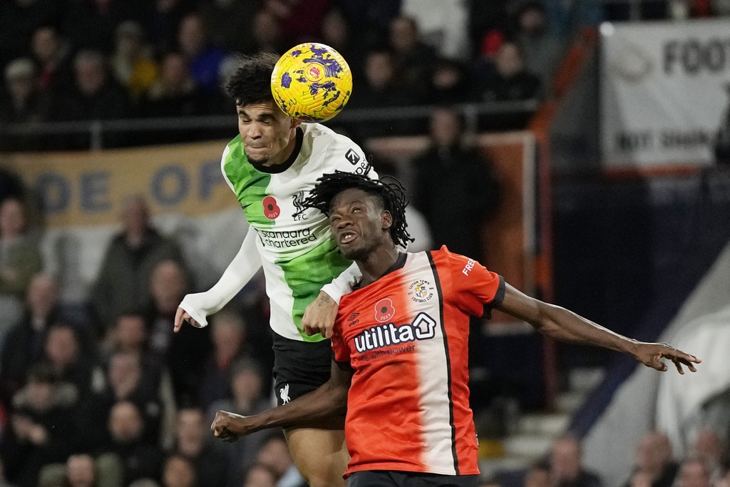 Liverpool’s Luis Diaz celebrates after scoring his side’s first goal during the English Premier League soccer match between Luton Town and Liverpool, at Kenilworth Road, in Luton, England, Sunday, Nov. 5, 2023. (Alastair Grant)Liverpool’s Trent Alexander-Arnold watches during the English Premier League soccer match between Luton Town and Liverpool, at Kenilworth Road, in Luton, England, Sunday, Nov. 5, 2023. (Alastair Grant)Luton Town’s Tahith Chong scores his side’s first goal during the English Premier League soccer match between Luton Town and Liverpool, at Kenilworth Road, in Luton, England, Sunday, Nov. 5, 2023. (Alastair Grant)Liverpool’s Ryan Gravenberch, center, challenges for the ball with Luton Town’s Ross Barkley, left, and his teammate Andros Townsend during the English Premier League soccer match between Luton Town and Liverpool, at Kenilworth Road, in Luton, England, Sunday, Nov. 5, 2023. (Alastair Grant)Luton Town’s Carlton Morris makes an attempt to score during the English Premier League soccer match between Luton Town and Liverpool, at Kenilworth Road, in Luton, England, Sunday, Nov. 5, 2023. (Alastair Grant)Luton Town’s Issa Kabore, left, is talked by Liverpool’s Diogo Jota during the English Premier League soccer match between Luton Town and Liverpool, at Kenilworth Road, in Luton, England, Sunday, Nov. 5, 2023. (Alastair Grant)Liverpool’s Trent Alexander-Arnold, left, challenges for the ball with Luton Town’s Chiedozie Ogbene during the English Premier League soccer match between Luton Town and Liverpool, at Kenilworth Road, in Luton, England, Sunday, Nov. 5, 2023. (Alastair Grant)Liverpool’s Dominik Szoboszlai, right, challenges for the ball with Luton Town’s Gabriel Osho during the English Premier League soccer match between Luton Town and Liverpool, at Kenilworth Road, in Luton, England, Sunday, Nov. 5, 2023. (Alastair Grant)Liverpool’s Dominik Szoboszlai heads the ball during the English Premier League soccer match between Luton Town and Liverpool, at Kenilworth Road, in Luton, England, Sunday, Nov. 5, 2023. (Alastair Grant)Liverpool’s Trent Alexander-Arnold, left, challenges for the ball with Luton Town’s Chiedozie Ogbene during the English Premier League soccer match between Luton Town and Liverpool, at Kenilworth Road, in Luton, England, Sunday, Nov. 5, 2023. (Alastair Grant)Liverpool’s Darwin Nunez, left, challenges for the ball with Luton Town’s Teden Mengi during the English Premier League soccer match between Luton Town and Liverpool, at Kenilworth Road, in Luton, England, Sunday, Nov. 5, 2023. (Alastair Grant)Liverpool’s Luis Diaz heads the ball to score his side’s first goal during the English Premier League soccer match between Luton Town and Liverpool, at Kenilworth Road, in Luton, England, Sunday, Nov. 5, 2023. (Alastair Grant)Liverpool’s Luis Diaz celebrates after scoring his side’s first goal during the English Premier League soccer match between Luton Town and Liverpool, at Kenilworth Road, in Luton, England, Sunday, Nov. 5, 2023.Luis Diaz has returned to Liverpool’s squad for its Premier League match against Luton with his father still missing after being kidnapped by a guerrilla group in Colombia. (Alastair Grant)Liverpool’s Luis Diaz, left, challenges for the ball with Luton Town’s Tahith Chong during the English Premier League soccer match between Luton Town and Liverpool, at Kenilworth Road, in Luton, England, Sunday, Nov. 5, 2023. (Alastair Grant)Liverpool’s Luis Diaz celebrates with his teammates after scoring his side’s first goal during the English Premier League soccer match between Luton Town and Liverpool, at Kenilworth Road, in Luton, England, Sunday, Nov. 5, 2023. (Alastair Grant)Liverpool’s Luis Diaz celebrates at the end of the English Premier League soccer match between Luton Town and Liverpool, at Kenilworth Road, in Luton, England, Sunday, Nov. 5, 2023. (Alastair Grant)