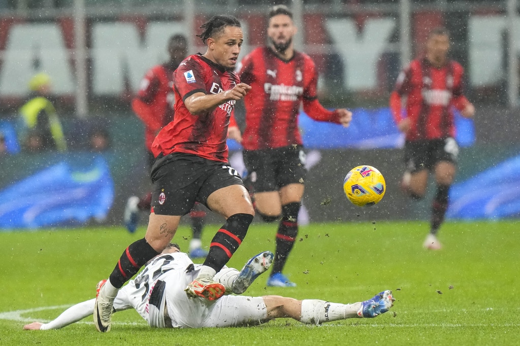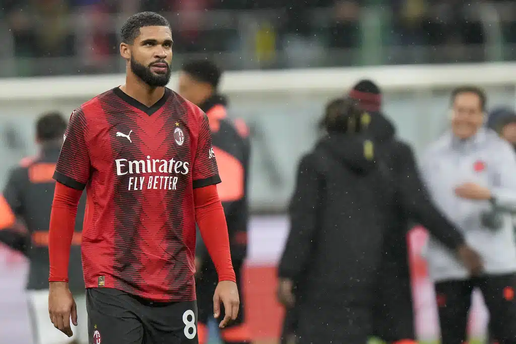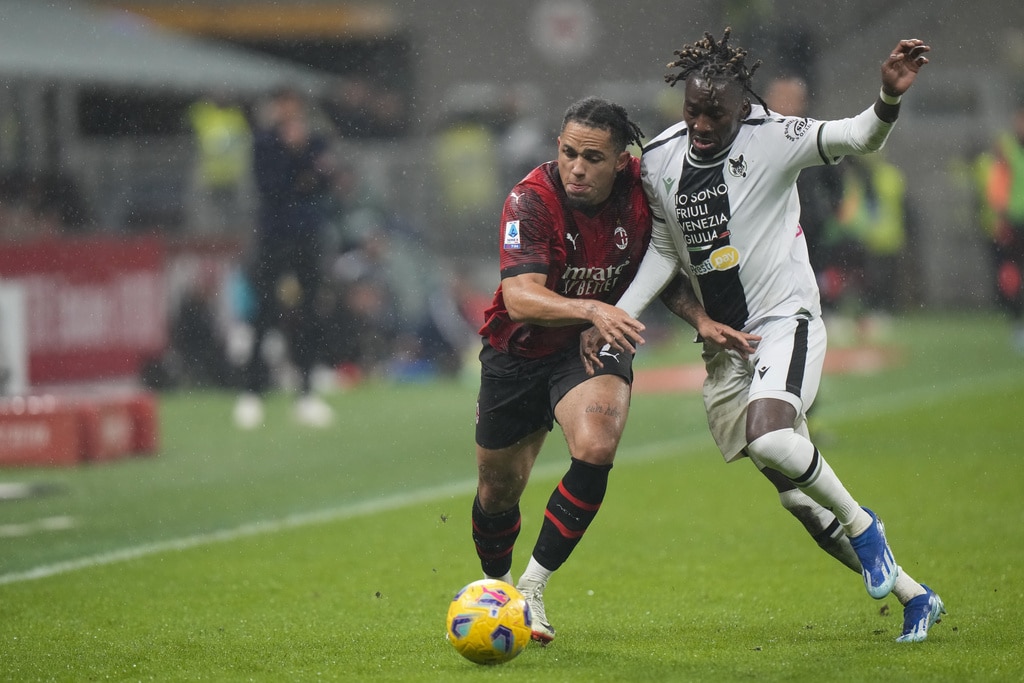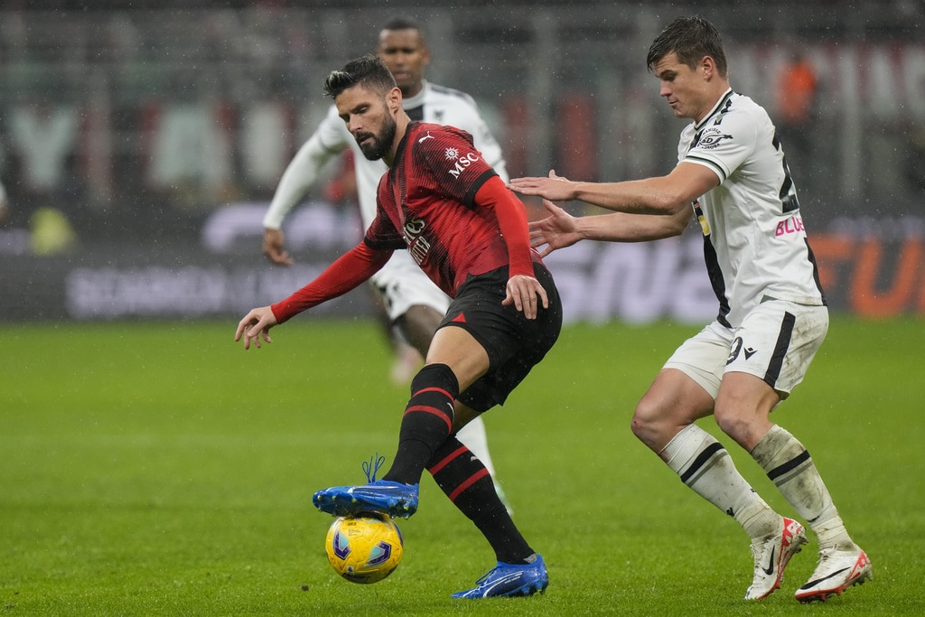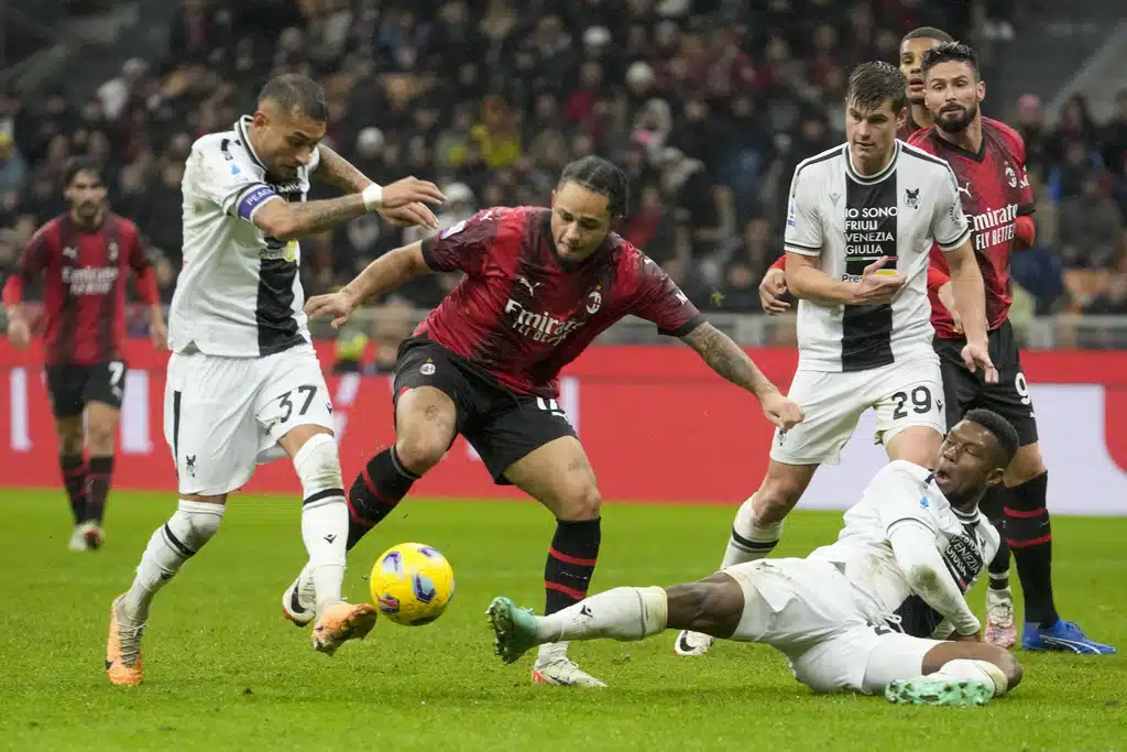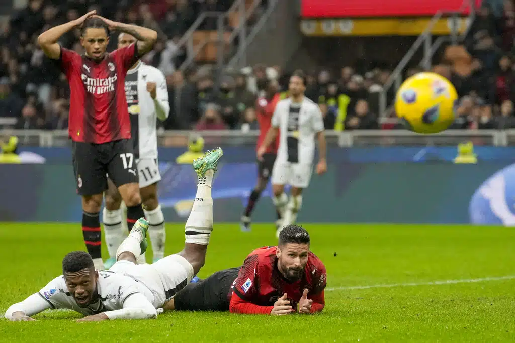 Udinese’s Nehuen Perez, right, tries to block a shot from AC Milan’s Tijjani Reijnders during a Serie A soccer match between AC Milan and Udinese, at the San Siro stadium in Milan, Italy, Saturday, Nov. 4, 2023. (AP Photo/Luca Bruno)AC Milan’s Davide Calabria reacts at the end of a Serie A soccer match between AC Milan and Udinese, at the San Siro stadium in Milan, Italy, Saturday, Nov. 4, 2023. (AP Photo/Luca Bruno)AC Milan’s Ruben Loftus-Cheek reacts at the end of a Serie A soccer match between AC Milan and Udinese, at the San Siro stadium in Milan, Italy, Saturday, Nov. 4, 2023. (AP Photo/Luca Bruno)Udinese’s goalkeeper Marco Silvestri celebrates with a team member at the end of a Serie A soccer match between AC Milan and Udinese, at the San Siro stadium in Milan, Italy, Saturday, Nov. 4, 2023. (AP Photo/Luca Bruno)AC Milan’s Olivier Giroud, left, and Udinese’s Jaka Bijol react at the end of a Serie A soccer match between AC Milan and Udinese, at the San Siro stadium in Milan, Italy, Saturday, Nov. 4, 2023. (AP Photo/Luca Bruno)AC Milan’s Rafael Leao reacts during a Serie A soccer match between AC Milan and Udinese, at the San Siro stadium in Milan, Italy, Saturday, Nov. 4, 2023. (AP Photo/Luca Bruno)AC Milan’s Olivier Giroud, right, reacts after missing a chance to score during a Serie A soccer match between AC Milan and Udinese, at the San Siro stadium in Milan, Italy, Saturday, Nov. 4, 2023. (AP Photo/Luca Bruno)AC Milan’s Noah Okafor, center, duels for the ball with Udinese’s Roberto Pereyra, left, during a Serie A soccer match between AC Milan and Udinese, at the San Siro stadium in Milan, Italy, Saturday, Nov. 4, 2023. (AP Photo/Luca Bruno)AC Milan’s Olivier Giroud, left, duels for the ball with Udinese’s Christian Kabasele during a Serie A soccer match between AC Milan and Udinese, at the San Siro stadium in Milan, Italy, Saturday, Nov. 4, 2023. (AP Photo/Luca Bruno)AC Milan’s Noah Okafor, left, duels for the ball with Udinese’s Jordan Zemura during a Serie A soccer match between AC Milan and Udinese, at the San Siro stadium in Milan, Italy, Saturday, Nov. 4, 2023. (AP Photo/Luca Bruno)AC Milan’s Noah Okafor, left, duels for the ball with Udinese’s Jordan Zemura during a Serie A soccer match between AC Milan and Udinese, at the San Siro stadium in Milan, Italy, Saturday, Nov. 4, 2023. (AP Photo/Luca Bruno)AC Milan’s Olivier Giroud, left, duels for the ball with Udinese’s Jaka Bijol during a Serie A soccer match between AC Milan and Udinese, at the San Siro stadium in Milan, Italy, Saturday, Nov. 4, 2023. (AP Photo/Luca Bruno)AC Milan’s Yacine Adli, left, duels for the ball with Udinese’s Roberto Pereyra during a Serie A soccer match between AC Milan and Udinese, at the San Siro stadium in Milan, Italy, Saturday, Nov. 4, 2023. (AP Photo/Luca Bruno)AC Milan’s Noah Okafor, top, duels for the ball with Udinese’s Martin Payero during a Serie A soccer match between AC Milan and Udinese, at the San Siro stadium in Milan, Italy, Saturday, Nov. 4, 2023. (AP Photo/Luca Bruno)AC Milan’s Rafael Leao controls the ball during a Serie A soccer match between AC Milan and Udinese, at the San Siro stadium in Milan, Italy, Saturday, Nov. 4, 2023. (AP Photo/Luca Bruno)
