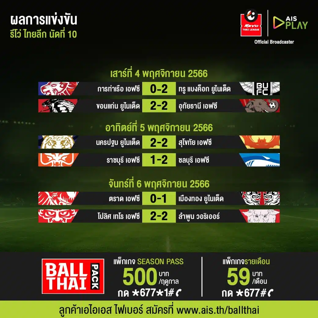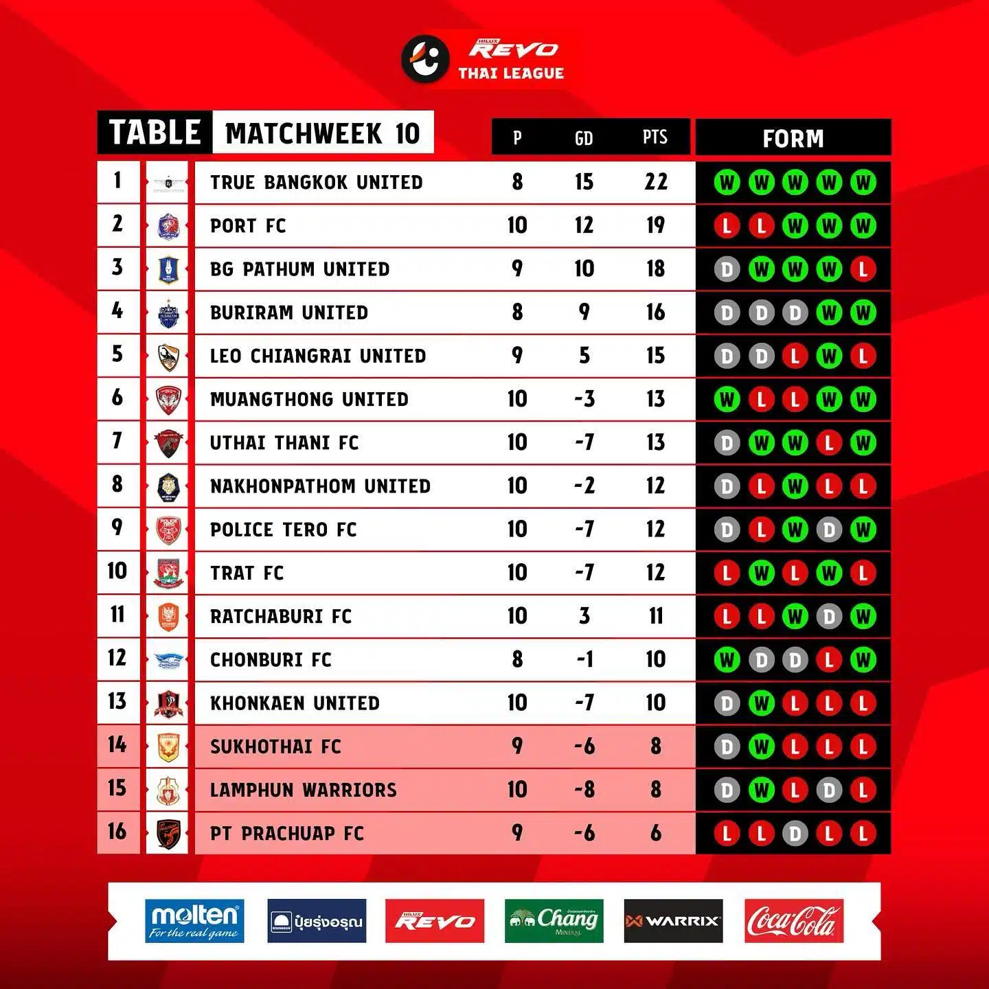 สรุปผลการแข่งขัน รีโว่ ไทยลีก 2023/24 หลังจบนัดที่ 10