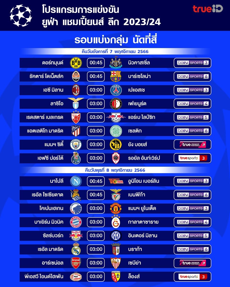 ยูฟ่า แชมเปี้ยนส์ลีก รอบแบ่งกลุ่ม 2023/24 วันพุธที่ 8 พฤศจิกายน 2566