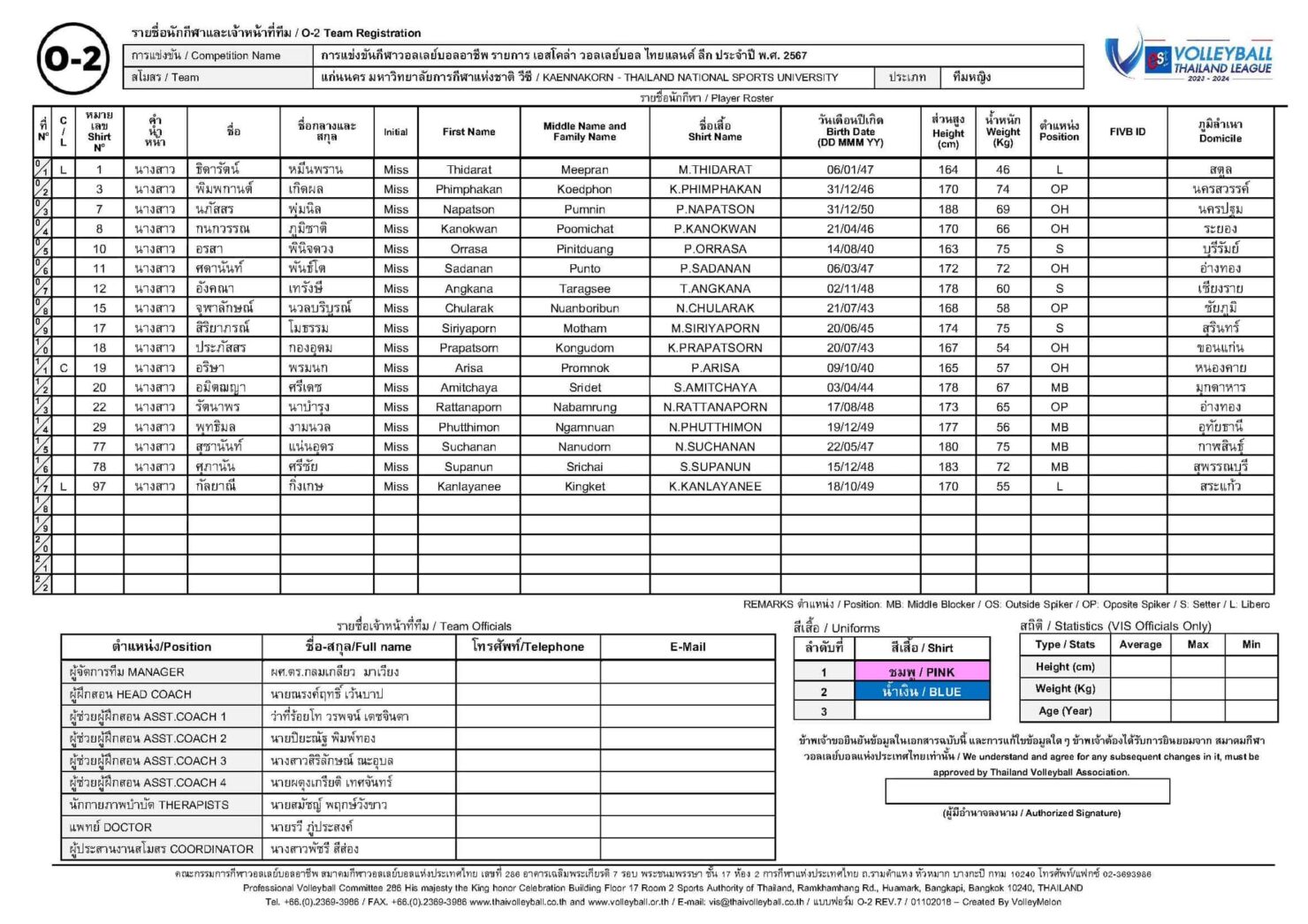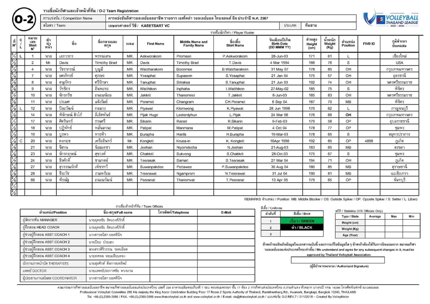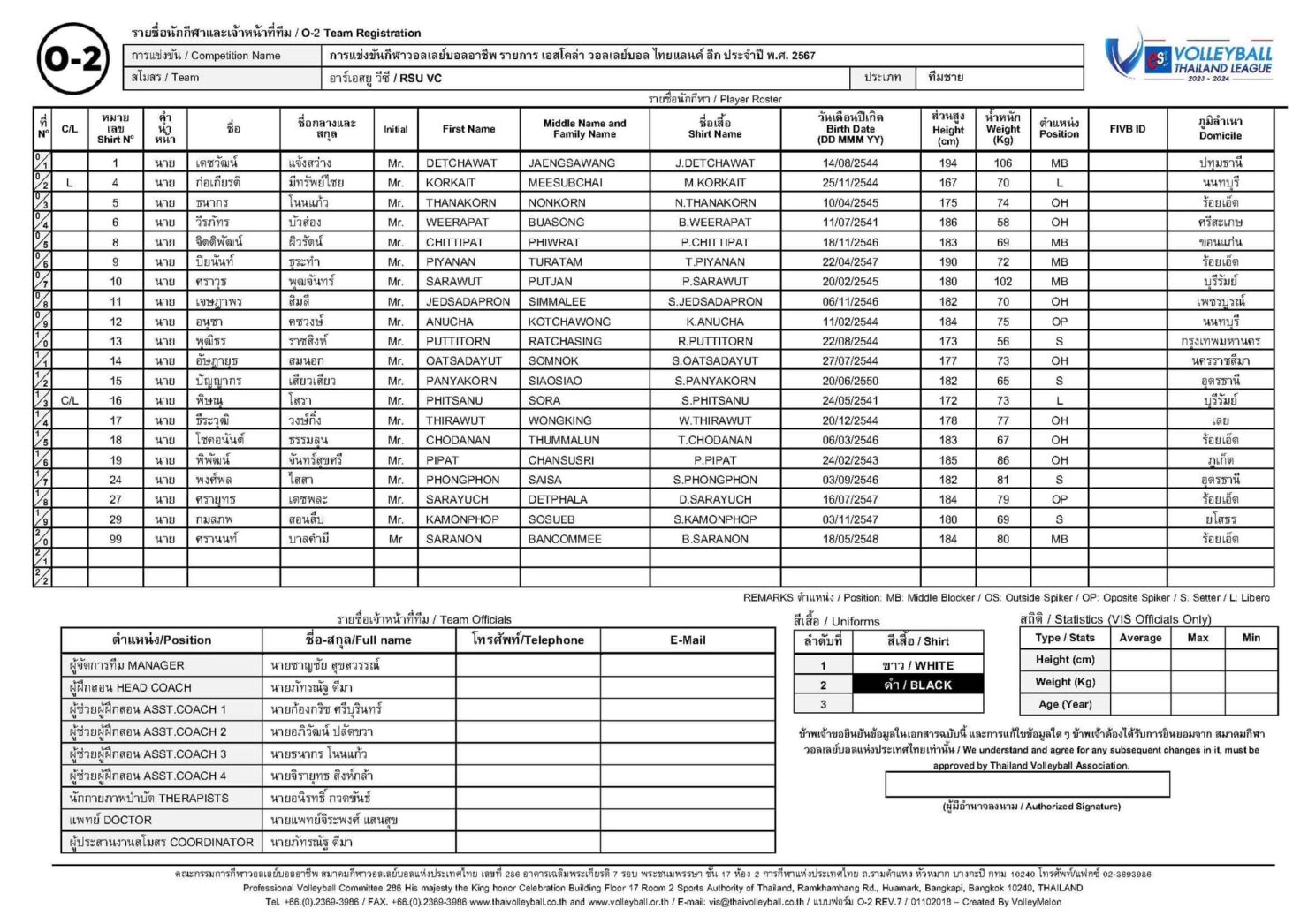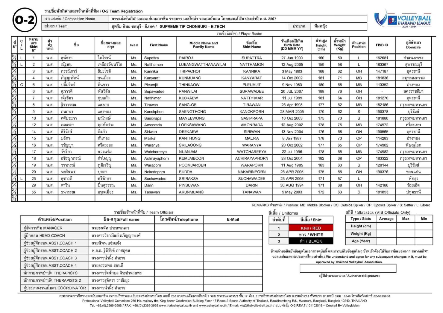 วันที่ 6 พ.ย. 2023 ทางเพจ Volleyball Thailand League ได้ออกมาเปิดเผยรายชื่อนักกีฬาและเจ้าหน้าที่ทีม รายการ เอสโคล่า วอลเลย์บอล ไทยแลนด์ ลีก ประจำปี 2567 อย่างเป็นทางการ