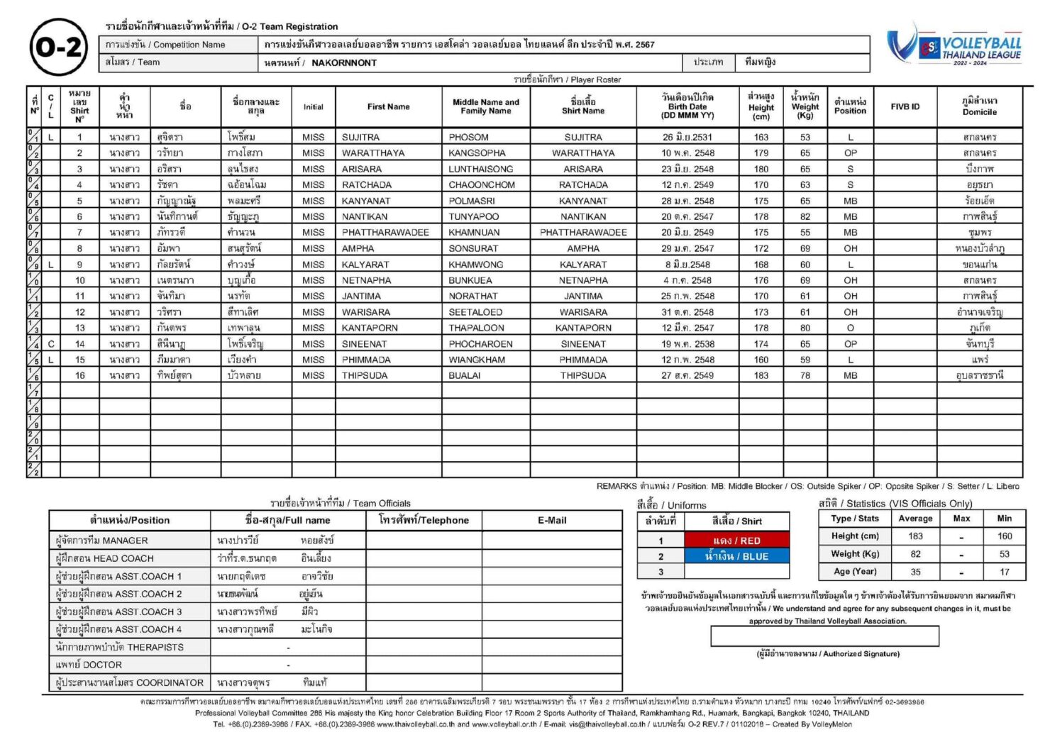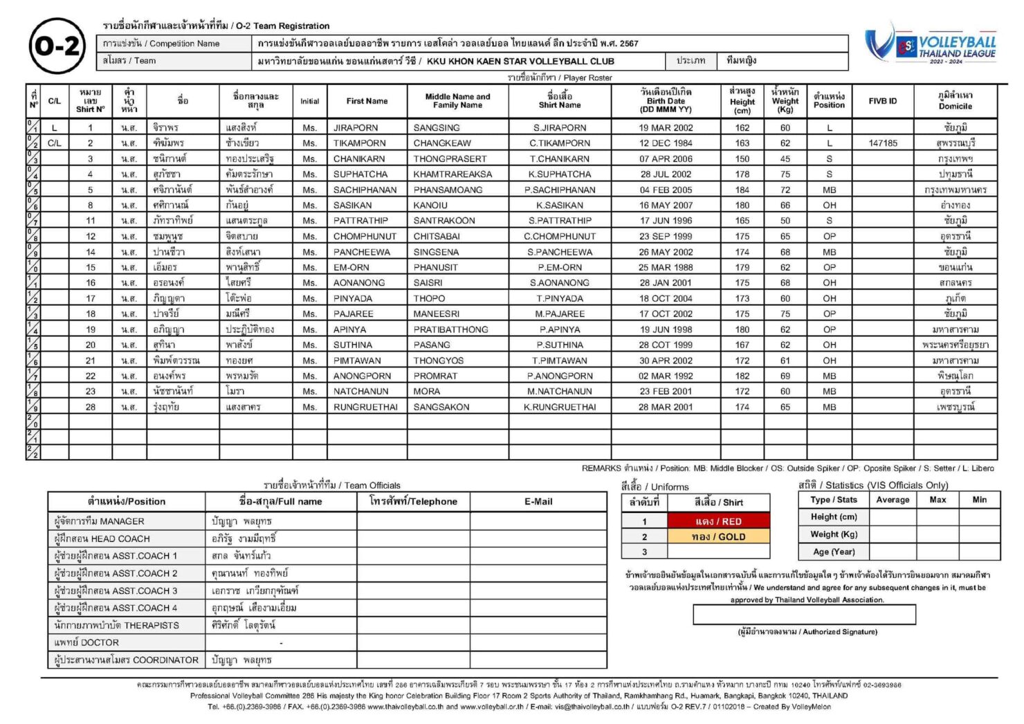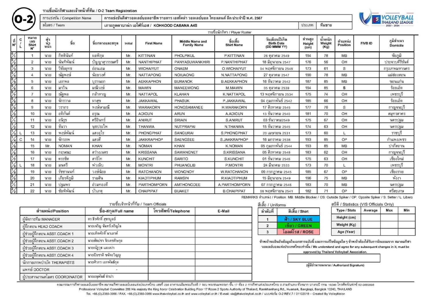 วันที่ 6 พ.ย. 2023 ทางเพจ Volleyball Thailand League ได้ออกมาเปิดเผยรายชื่อนักกีฬาและเจ้าหน้าที่ทีม รายการ เอสโคล่า วอลเลย์บอล ไทยแลนด์ ลีก ประจำปี 2567 อย่างเป็นทางการ