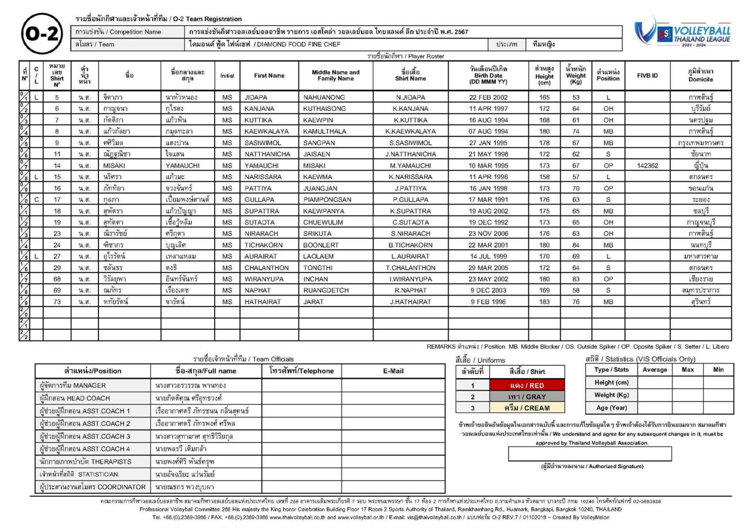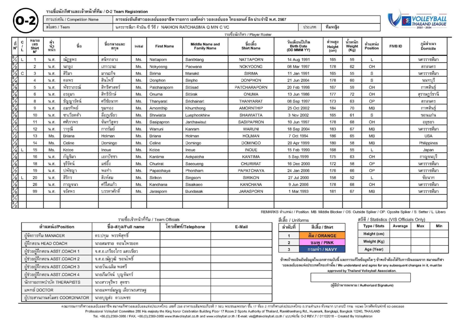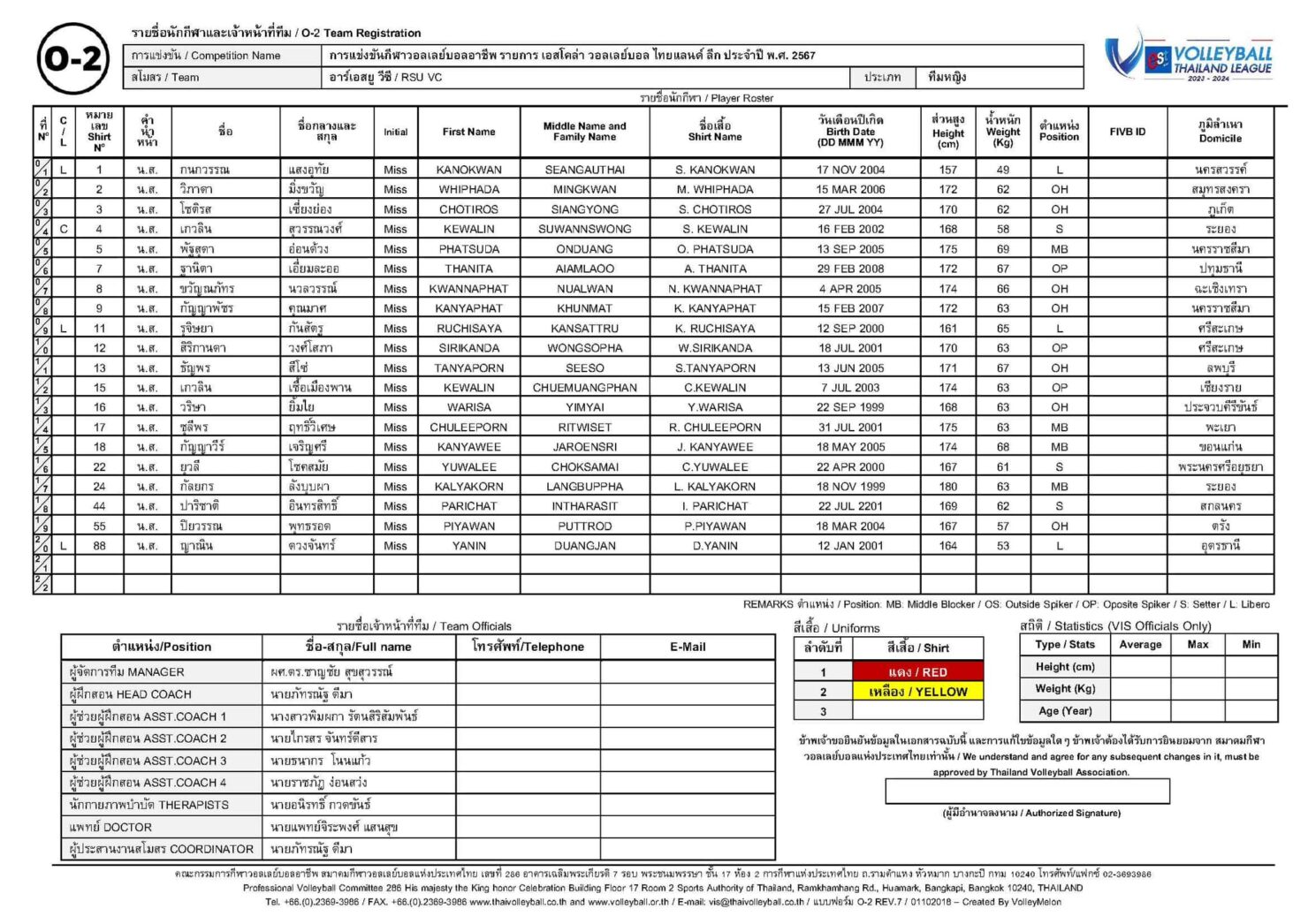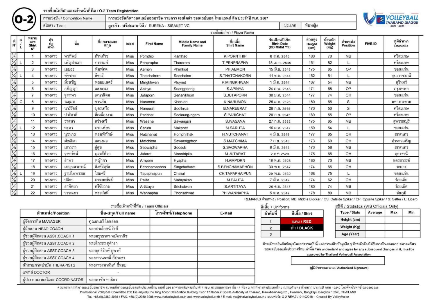 รายชื่อนักกีฬาและเจ้าหน้าที่ทีม เอสโคล่า วอลเลย์บอล ไทยแลนด์ ลีก ประจำปี 2567
