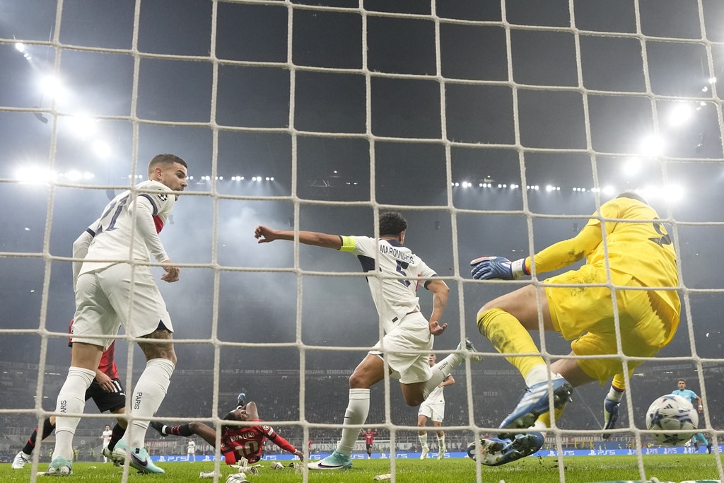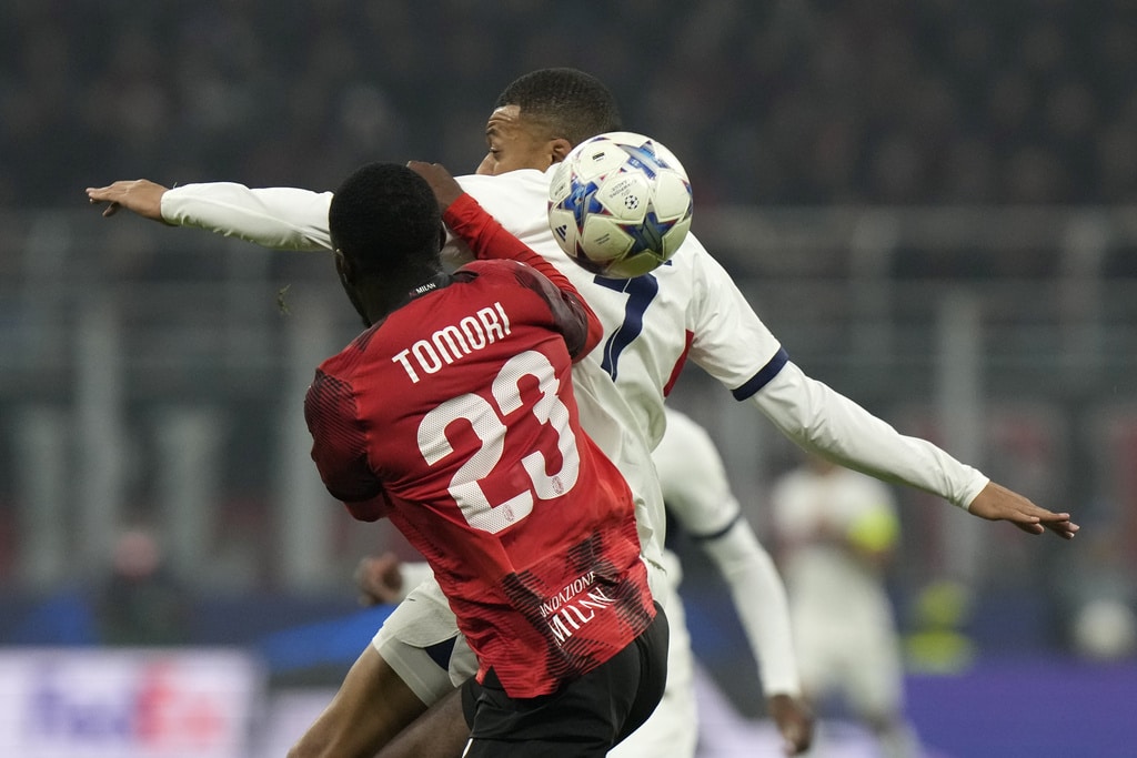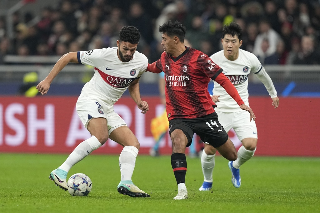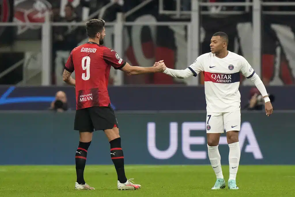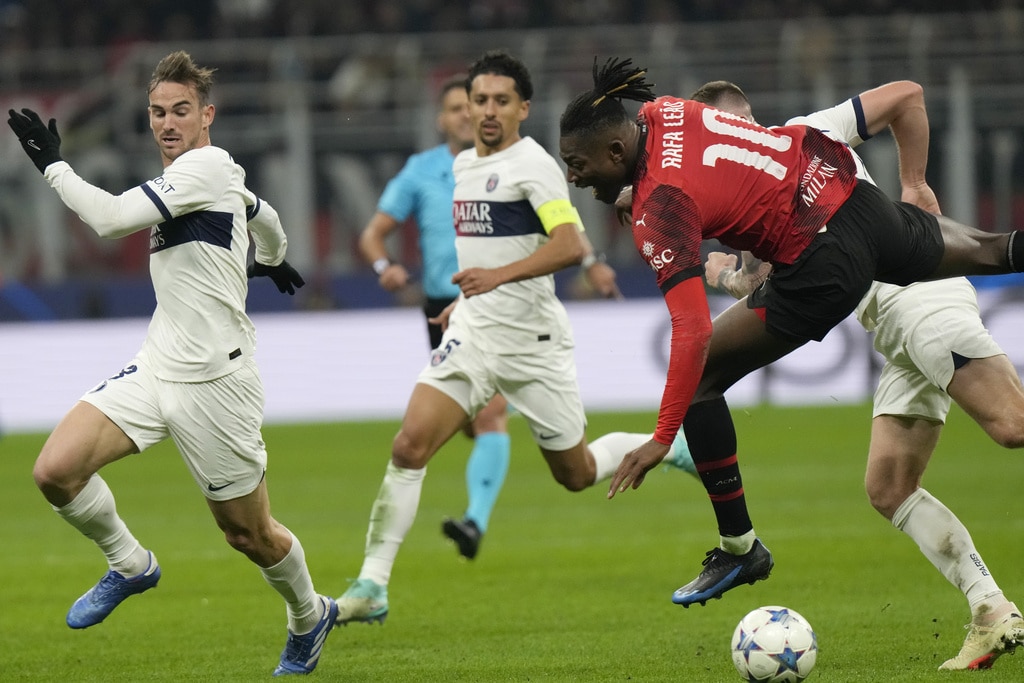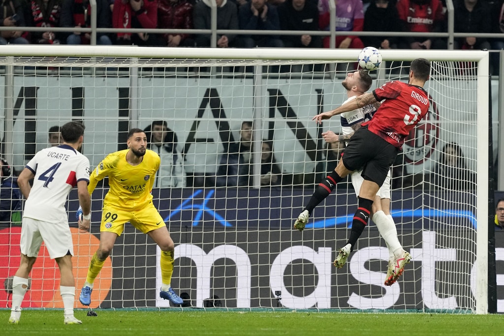 PSG’s Manuel Ugarte, left, challenge AC Milan’s Tijjani Reijnders during the Champions League group F soccer match between AC Milan and Paris Saint Germain at the San Siro stadium in Milan, Italy, Tuesday, Nov. 7, 2023. (AP Photo/Antonio Calanni)AC Milan’s Rafael Leao celebrates with AC Milan’s Christian Pulisic, right, after scoring a goal with an overhead kick during the Champions League group F soccer match between AC Milan and Paris Saint Germain at the San Siro stadium in Milan, Italy, Tuesday, Nov. 7, 2023. (AP Photo/Antonio Calanni)PSG’s Lee Kang-in reacts after the Champions League group F soccer match between AC Milan and Paris Saint Germain at the San Siro stadium in Milan, Italy, Tuesday, Nov. 7, 2023. Milan won the match 2-1. (AP Photo/Antonio Calanni)PSG’s goalkeeper Gianluigi Donnarumma leaves the field at the end of the Champions League, Group F soccer match between AC Milan and PSG, at the San Siro stadium in Milan, Italy, Tuesday, Nov. 7, 2023. AC Milan won 2-1. (AP Photo/Luca Bruno)AC Milan’s Olivier Giroud, left, greets PSG’s Kylian Mbappe at the end of the Champions League, Group F soccer match between AC Milan and PSG, at the San Siro stadium in Milan, Italy, Tuesday, Nov. 7, 2023. AC Milan won 2-1. (AP Photo/Luca Bruno)AC Milan’s Olivier Giroud celebrates at the end of the Champions League, Group F soccer match between AC Milan and PSG, at the San Siro stadium in Milan, Italy, Tuesday, Nov. 7, 2023. AC Milan won 2-1. (AP Photo/Luca Bruno)AC Milan’s Rafael Leao celebrates after scoring a goal with an overhead kick during the Champions League group F soccer match between AC Milan and Paris Saint Germain at the San Siro stadium in Milan, Italy, Tuesday, Nov. 7, 2023. (AP Photo/Antonio Calanni)AC Milan’s Olivier Giroud and AC Milan’s Rafael Leao, right, greet each other after the Champions League group F soccer match between AC Milan and Paris Saint Germain at the San Siro stadium in Milan, Italy, Tuesday, Nov. 7, 2023. Milan won the match 2-1, with both players scoring. (AP Photo/Antonio Calanni)AC Milan’s Rafael Leao, right, is fouled by PSG’s Milan Skriniar during the Champions League, Group F soccer match between AC Milan and PSG, at the San Siro stadium in Milan, Italy, Tuesday, Nov. 7, 2023. (AP Photo/Luca Bruno)Referee Jesus Gil Manzano, right, shows a yellow card to PSG’s Milan Skriniar after he fouled AC Milan’s Rafael Leao during the Champions League, Group F soccer match between AC Milan and PSG, at the San Siro stadium in Milan, Italy, Tuesday, Nov. 7, 2023. (AP Photo/Luca Bruno)AC Milan’s Christian Pulisic reacts after getting injured during the Champions League group F soccer match between AC Milan and Paris Saint Germain at the San Siro stadium in Milan, Italy, Tuesday, Nov. 7, 2023. (AP Photo/Antonio Calanni)PSG’s Goncalo Ramos, left, is challenged by AC Milan’s Tijjani Reijnders during the Champions League group F soccer match between AC Milan and Paris Saint Germain at the San Siro stadium in Milan, Italy, Tuesday, Nov. 7, 2023. (AP Photo/Antonio Calanni)PSG’s Milan Skriniar takes a shot during the Champions League group F soccer match between AC Milan and Paris Saint Germain at the San Siro stadium in Milan, Italy, Tuesday, Nov. 7, 2023. (AP Photo/Antonio Calanni)AC Milan’s Rafael Leao, left, tries to hold off PSG’s Achraf Hakimi during the Champions League group F soccer match between AC Milan and Paris Saint Germain at the San Siro stadium in Milan, Italy, Tuesday, Nov. 7, 2023. (AP Photo/Antonio Calanni)PSG’s Kylian Mbappe, background, is challenged by AC Milan’s Fikayo Tomori during the Champions League, Group F soccer match between AC Milan and PSG, at the San Siro stadium in Milan, Italy, Tuesday, Nov. 7, 2023. (AP Photo/Luca Bruno)AC Milan’s Olivier Giroud, right, scores his side’s second goal during the Champions League group F soccer match between AC Milan and Paris Saint Germain at the San Siro stadium in Milan, Italy, Tuesday, Nov. 7, 2023. (AP Photo/Antonio Calanni)AC Milan’s Rafael Leao, 3rd left, scores a goal with an overhead kick during the Champions League group F soccer match between AC Milan and Paris Saint Germain at the San Siro stadium in Milan, Italy, Tuesday, Nov. 7, 2023. (AP Photo/Antonio Calanni)