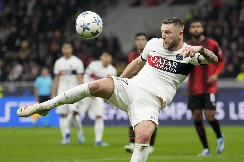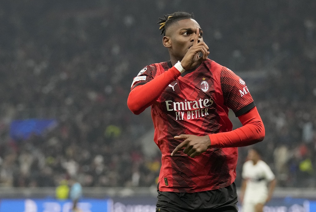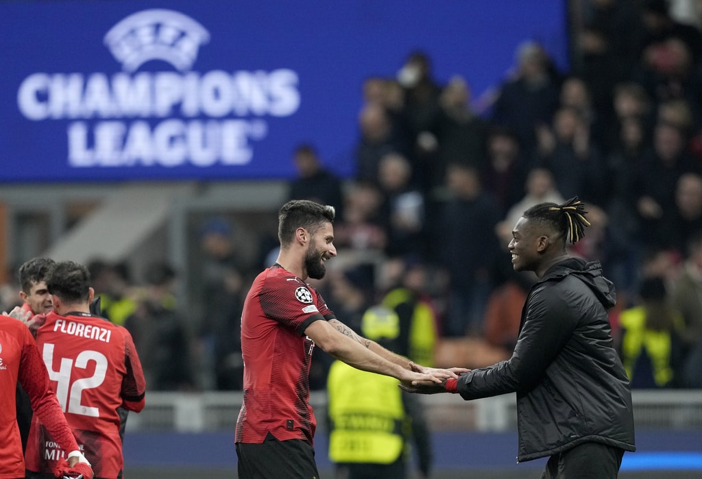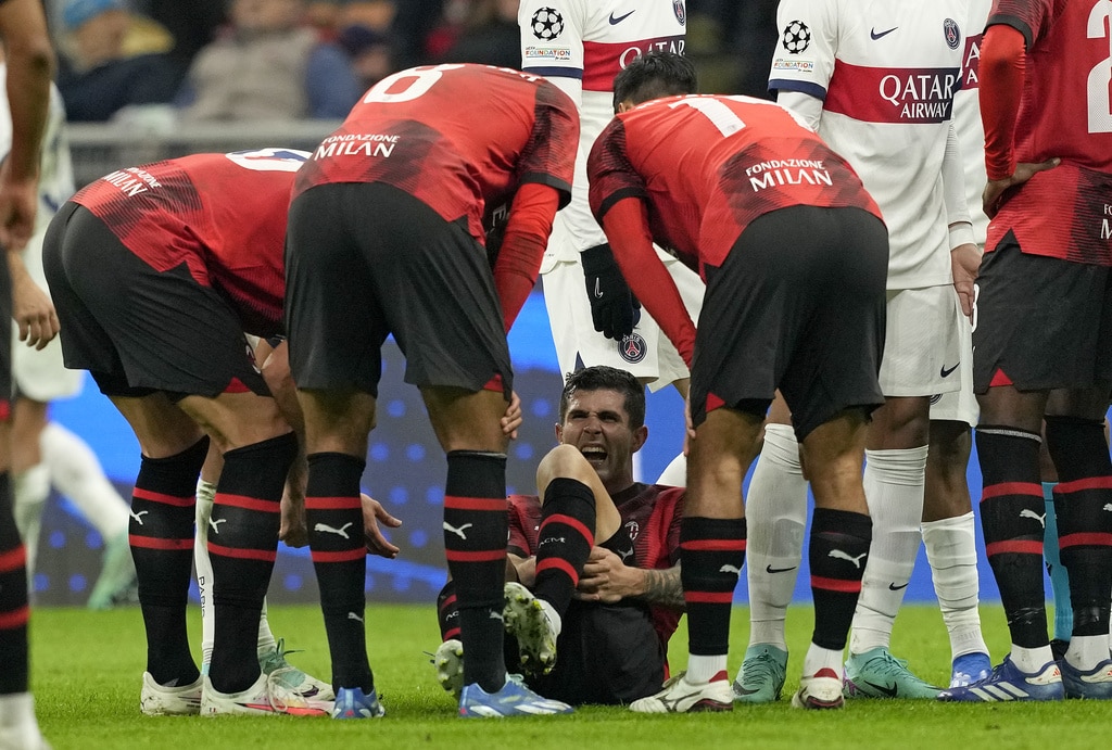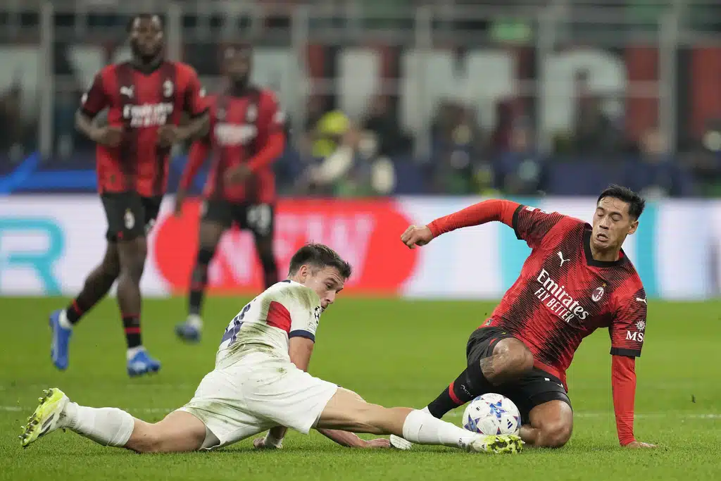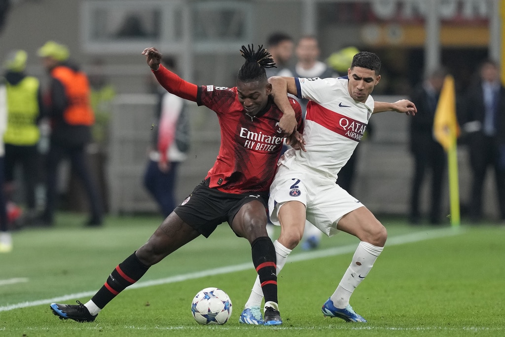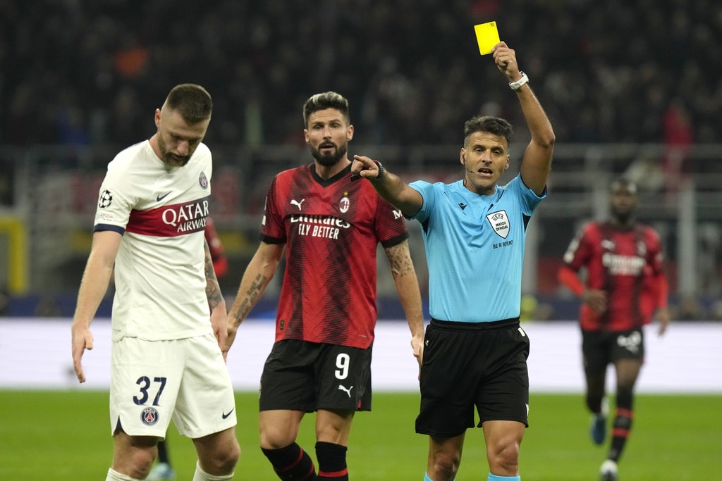 PSG’s Manuel Ugarte, left, challenge AC Milan’s Tijjani Reijnders during the Champions League group F soccer match between AC Milan and Paris Saint Germain at the San Siro stadium in Milan, Italy, Tuesday, Nov. 7, 2023. (AP Photo/Antonio Calanni)AC Milan’s Rafael Leao celebrates with AC Milan’s Christian Pulisic, right, after scoring a goal with an overhead kick during the Champions League group F soccer match between AC Milan and Paris Saint Germain at the San Siro stadium in Milan, Italy, Tuesday, Nov. 7, 2023. (AP Photo/Antonio Calanni)PSG’s Lee Kang-in reacts after the Champions League group F soccer match between AC Milan and Paris Saint Germain at the San Siro stadium in Milan, Italy, Tuesday, Nov. 7, 2023. Milan won the match 2-1. (AP Photo/Antonio Calanni)PSG’s goalkeeper Gianluigi Donnarumma leaves the field at the end of the Champions League, Group F soccer match between AC Milan and PSG, at the San Siro stadium in Milan, Italy, Tuesday, Nov. 7, 2023. AC Milan won 2-1. (AP Photo/Luca Bruno)AC Milan’s Olivier Giroud, left, greets PSG’s Kylian Mbappe at the end of the Champions League, Group F soccer match between AC Milan and PSG, at the San Siro stadium in Milan, Italy, Tuesday, Nov. 7, 2023. AC Milan won 2-1. (AP Photo/Luca Bruno)AC Milan’s Olivier Giroud celebrates at the end of the Champions League, Group F soccer match between AC Milan and PSG, at the San Siro stadium in Milan, Italy, Tuesday, Nov. 7, 2023. AC Milan won 2-1. (AP Photo/Luca Bruno)AC Milan’s Rafael Leao celebrates after scoring a goal with an overhead kick during the Champions League group F soccer match between AC Milan and Paris Saint Germain at the San Siro stadium in Milan, Italy, Tuesday, Nov. 7, 2023. (AP Photo/Antonio Calanni)AC Milan’s Olivier Giroud and AC Milan’s Rafael Leao, right, greet each other after the Champions League group F soccer match between AC Milan and Paris Saint Germain at the San Siro stadium in Milan, Italy, Tuesday, Nov. 7, 2023. Milan won the match 2-1, with both players scoring. (AP Photo/Antonio Calanni)AC Milan’s Rafael Leao, right, is fouled by PSG’s Milan Skriniar during the Champions League, Group F soccer match between AC Milan and PSG, at the San Siro stadium in Milan, Italy, Tuesday, Nov. 7, 2023. (AP Photo/Luca Bruno)Referee Jesus Gil Manzano, right, shows a yellow card to PSG’s Milan Skriniar after he fouled AC Milan’s Rafael Leao during the Champions League, Group F soccer match between AC Milan and PSG, at the San Siro stadium in Milan, Italy, Tuesday, Nov. 7, 2023. (AP Photo/Luca Bruno)AC Milan’s Christian Pulisic reacts after getting injured during the Champions League group F soccer match between AC Milan and Paris Saint Germain at the San Siro stadium in Milan, Italy, Tuesday, Nov. 7, 2023. (AP Photo/Antonio Calanni)PSG’s Goncalo Ramos, left, is challenged by AC Milan’s Tijjani Reijnders during the Champions League group F soccer match between AC Milan and Paris Saint Germain at the San Siro stadium in Milan, Italy, Tuesday, Nov. 7, 2023. (AP Photo/Antonio Calanni)PSG’s Milan Skriniar takes a shot during the Champions League group F soccer match between AC Milan and Paris Saint Germain at the San Siro stadium in Milan, Italy, Tuesday, Nov. 7, 2023. (AP Photo/Antonio Calanni)AC Milan’s Rafael Leao, left, tries to hold off PSG’s Achraf Hakimi during the Champions League group F soccer match between AC Milan and Paris Saint Germain at the San Siro stadium in Milan, Italy, Tuesday, Nov. 7, 2023. (AP Photo/Antonio Calanni)PSG’s Kylian Mbappe, background, is challenged by AC Milan’s Fikayo Tomori during the Champions League, Group F soccer match between AC Milan and PSG, at the San Siro stadium in Milan, Italy, Tuesday, Nov. 7, 2023. (AP Photo/Luca Bruno)AC Milan’s Olivier Giroud, right, scores his side’s second goal during the Champions League group F soccer match between AC Milan and Paris Saint Germain at the San Siro stadium in Milan, Italy, Tuesday, Nov. 7, 2023. (AP Photo/Antonio Calanni)AC Milan’s Rafael Leao, 3rd left, scores a goal with an overhead kick during the Champions League group F soccer match between AC Milan and Paris Saint Germain at the San Siro stadium in Milan, Italy, Tuesday, Nov. 7, 2023. (AP Photo/Antonio Calanni)