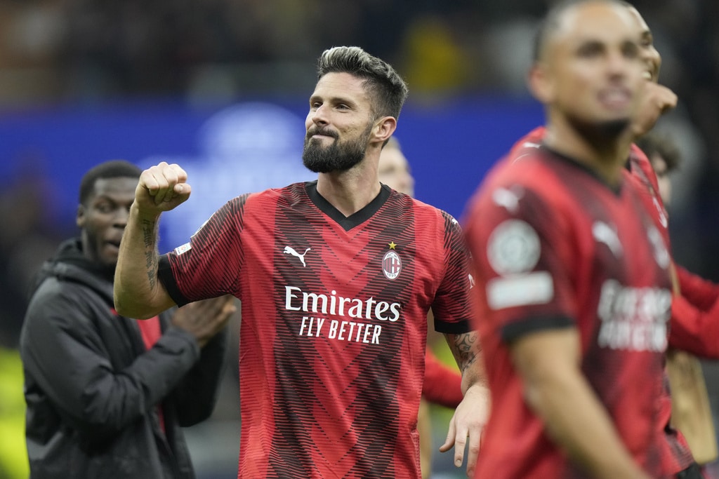 AC Milan’s Olivier Giroud celebrates after scoring his side’s second goal during the Champions League, Group F soccer match between AC Milan and PSG, at the San Siro stadium in Milan, Italy, Tuesday, Nov. 7, 2023. (AP Photo/Luca Bruno)