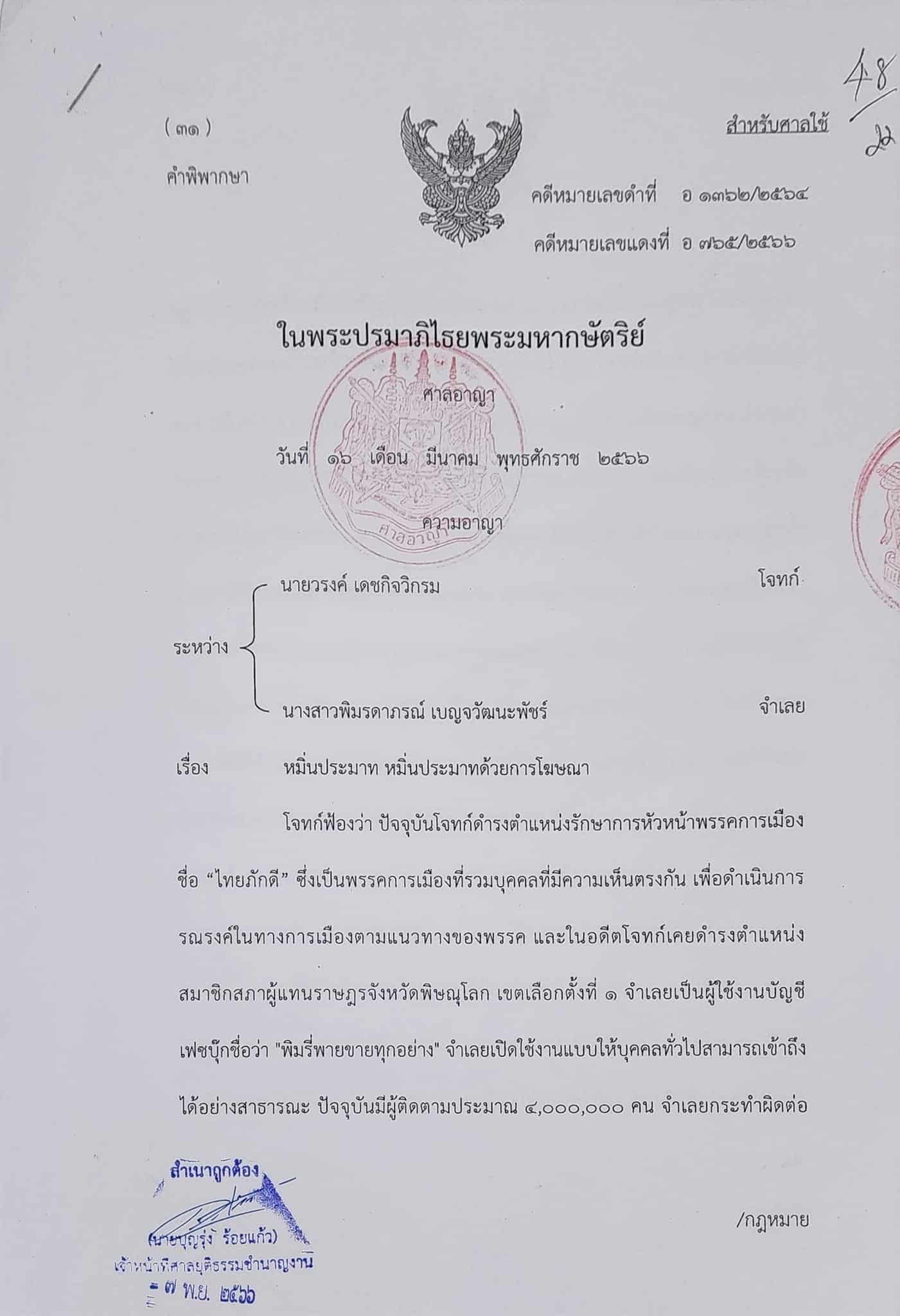 นพ.วรงค์ เดชกิจวิกรม ประธานพรรคไทยภักดี ได้โพสต์ภาพลงเฟซบุ๊ก จากกรณีที่ตนชนะคดีหมิ่นประมาท พิมรี่พาย หลังใช้ถ้อยคำรุนแรงขณะไลฟ์สดเมื่อปี 54 นั้น โดยหมอวรงค์ระบุว่า “#คำพิพากษาฉบับเต็มที่แม่ค้าออนไลน์ด่าผมได้มาแล้วครับ