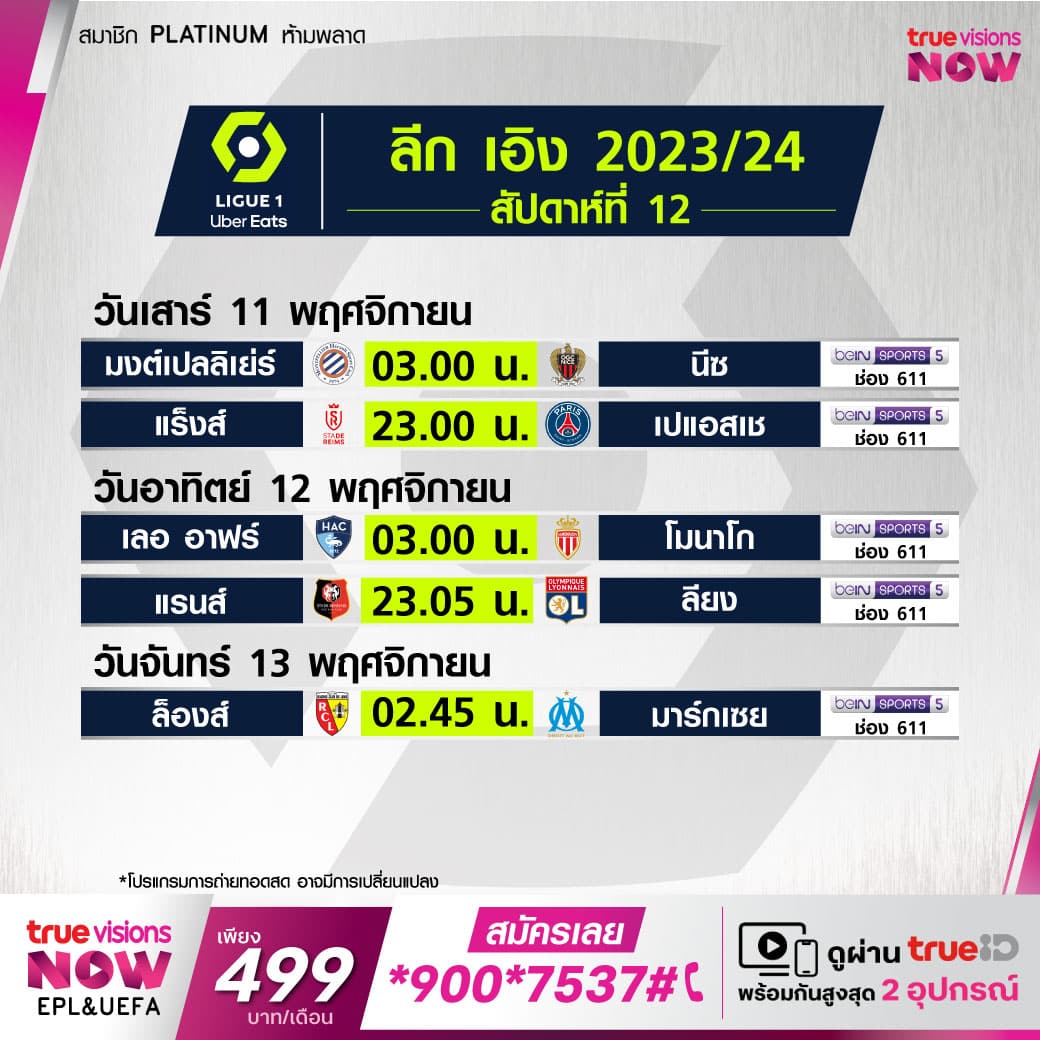 ตารางแข่งขัน ลีกเอิง ฝรั่งเศส โปรแกรมฟุตบอล ลีกเอิง 2023/24 สัปดาห์ที่ 12 ถ่ายทอดสดทาง beIN Sports และ True Sports