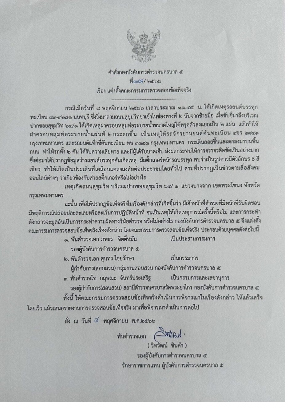 จึงลงนามคำสั่งคำสั่งกองบังคับการตำรวจนครบาล 5 ที่ 348/ 2566 เรื่อง แต่งตั้งคณะกรรมการตรวจสอบข้อเท็จจริง ฉะนั้น เพื่อให้ปรากฎข้อเท็จจริงในเรื่องดังกล่าวที่เกิดขึ้นว่า มีเจ้าหน้าที่ตำรวจที่มีหน้าที่รับผิดชอบมีพฤติการณ์ปล่อยปละละเลยหรือละเว้นการปฏิบัติหน้าที่ จนเป็นเหตุให้เกิดเหตุการณ์ครั้งนี้หรือไม่ และกรณีดังกล่าวจะมูลอันเป็นการกระทำความผิดทางวินัยตำรวจ หรือไม่ จึงแต่งตั้งคณะกรรมการตรวจสอบข้อเท็จจริงเรื่องดังกล่าว