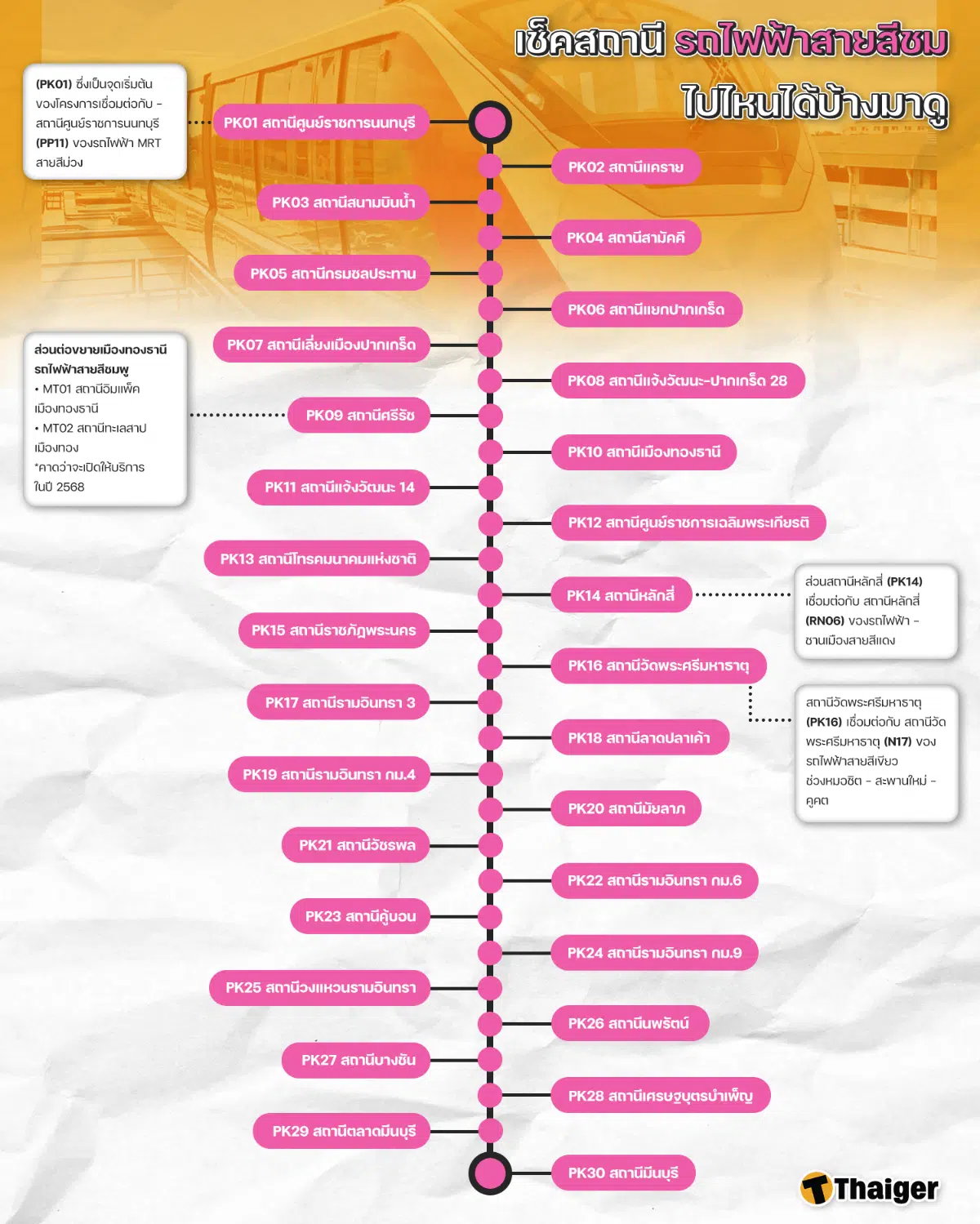 รถไฟฟ้าสายสีชมพูทั้งหมด 30 สถานี ภายใต้โครงการรถไฟฟ้าขนส่งมวลชนแห่งประเทศไทย รฟม. (MRT) ก่อสร้างชานชาลาและรางรถไฟลักษณะยกระดับเหนือถนนต่างจากรถไฟฟ้าใต้ที่เราคุ้นเคย โดยแต่ละสถานีจะเชื่อมต่อกับระบบขนส่งมวลชนสายอื่น ๆ เพื่อให้ผู้โดยสารสามารถเดินทางได้อย่างสะดวก พร้อมเปิดให้บริการนั่งฟรีแล้ววันเสาร์หน้า
