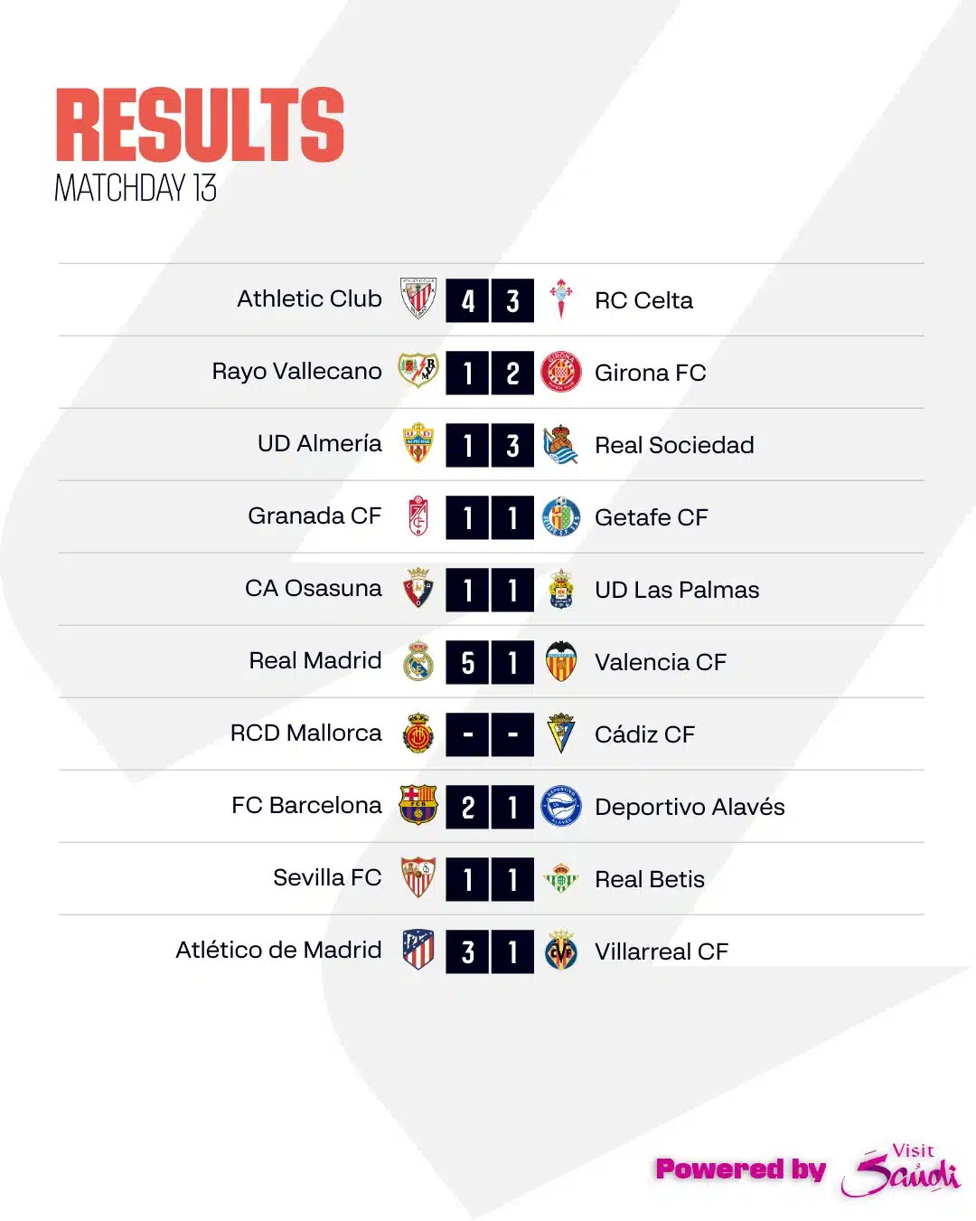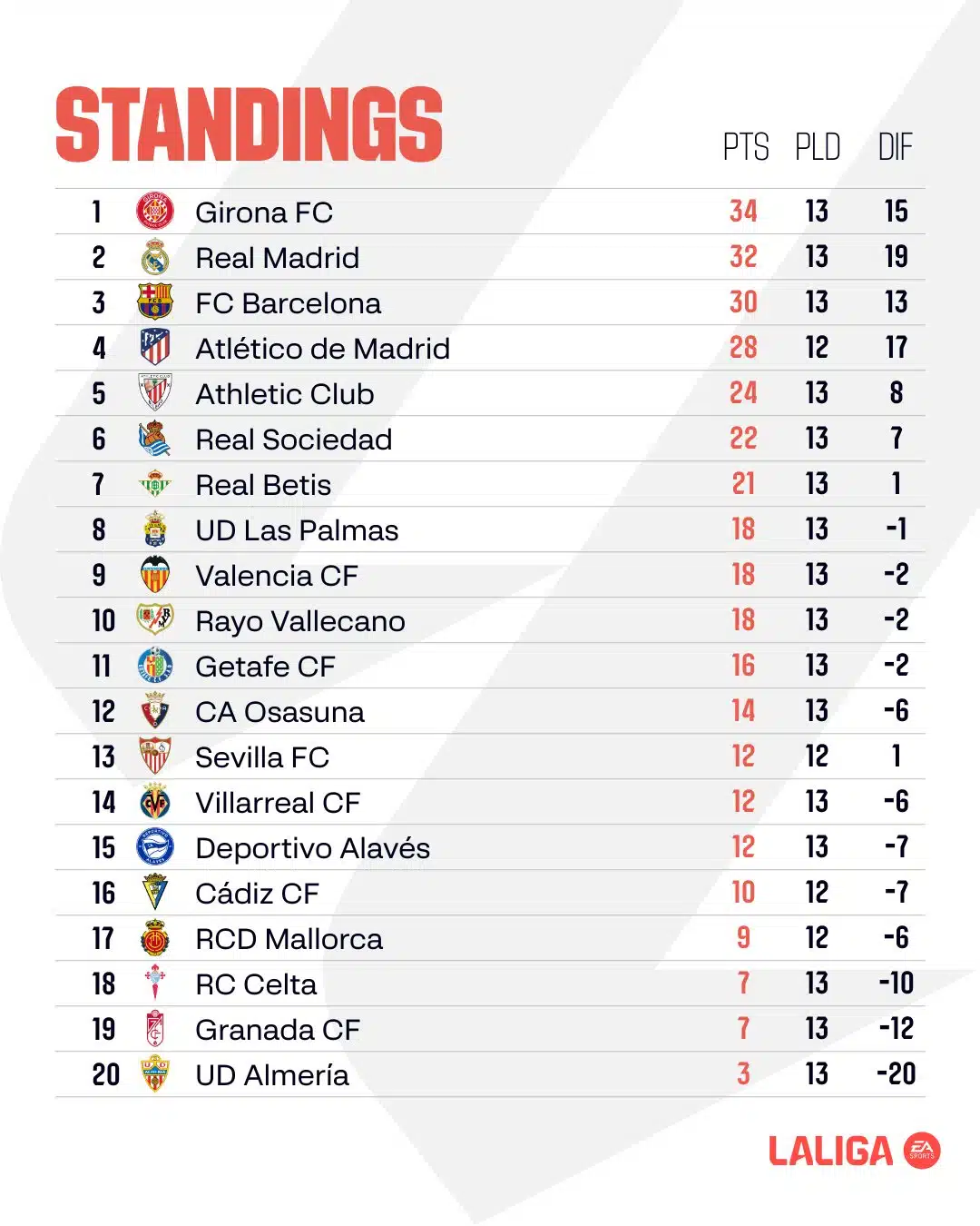 สรุปผล การแข่งขัน ลาลีกา สเปน 2023/24 หลังจบนัดที่ 13