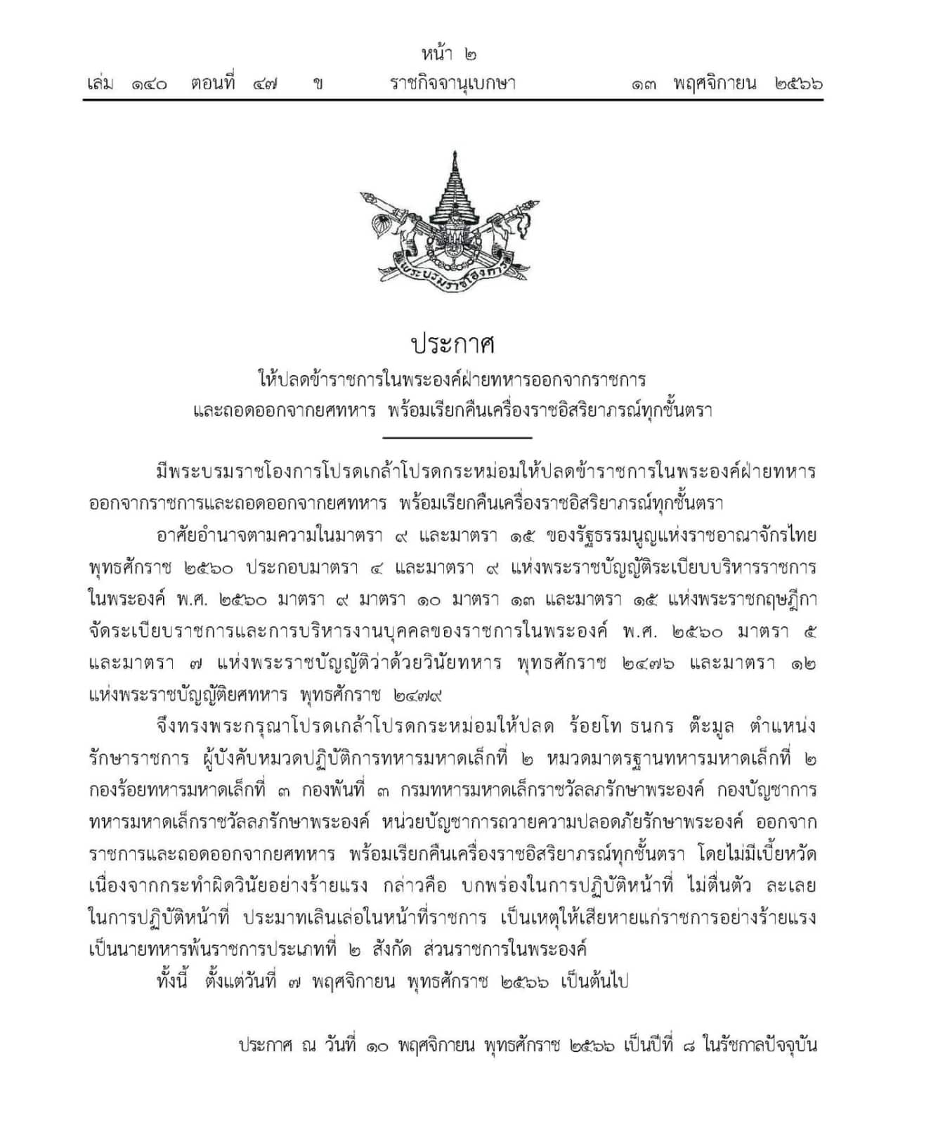 วันที่ 13 พฤศจิกายน 2566 ราชกิจจานุเบกษา เผยแพร่ประกาศ ให้ปลดข้าราชการในพระองค์ฝ่ายทหารออกจากราชการ และถอดออกจากยศทหาร พร้อมเรียกคืนเครื่องราชอิสริยาภรณ์ทุกชั้นตรา ความว่า