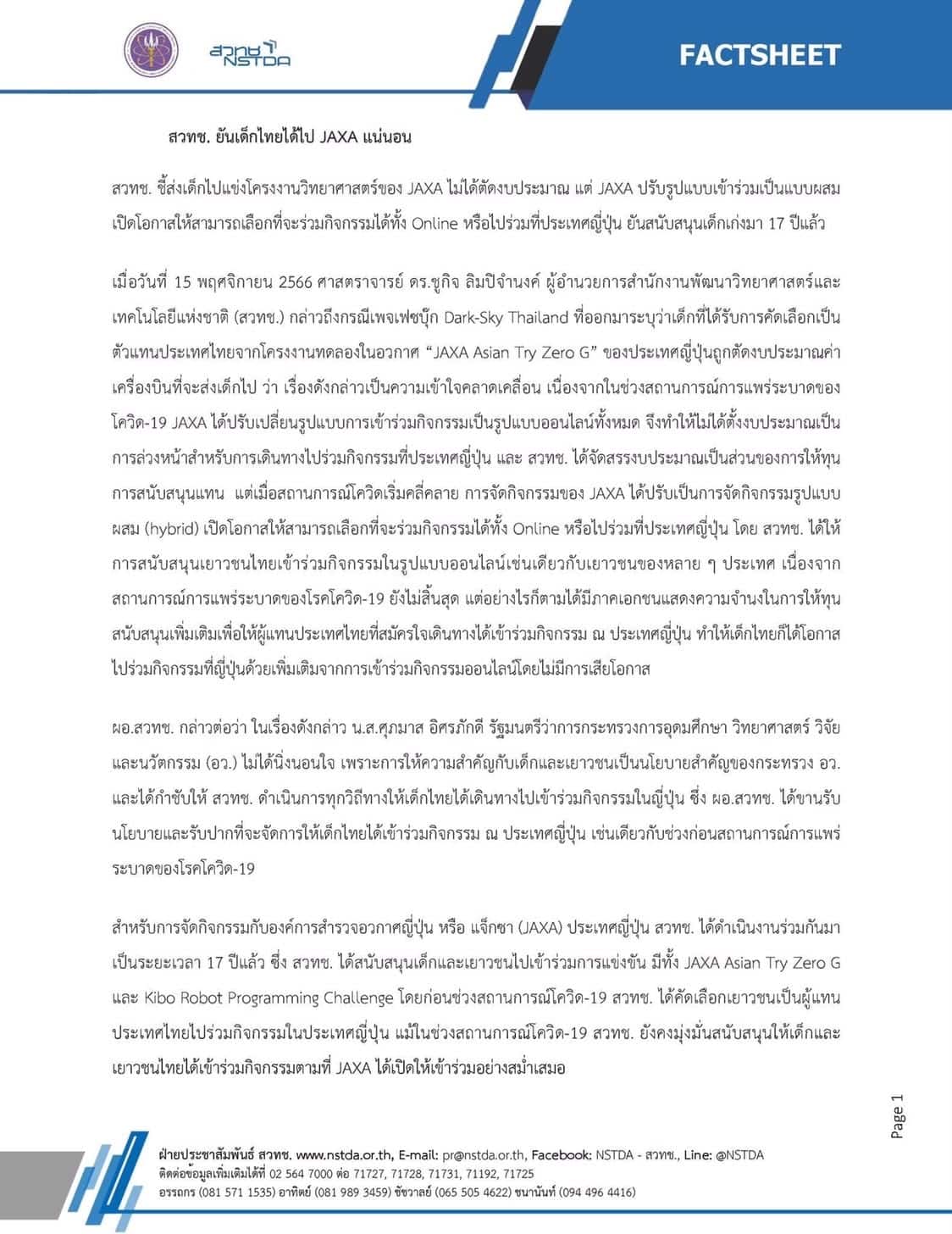 ว่าเรื่องดังกล่าวเป็นความเข้าใจคลาดเคลื่อน เนื่องจากในช่วงสถานการณ์การแพร่ระบาดของโควิด-19 JAXA ได้ปรับเปลี่ยนรูปแบบการเข้าร่วมกิจกรรมเป็นรูปแบบออนไลน์ทั้งหมด จึงทำให้ไม่ได้ตั้งงบประมาณเป็นการล่วงหน้าสำหรับการเดินทางไปร่วมกิจกรรมที่ประเทศญี่ปุ่น และ สวทช. ได้จัดสรรงบประมาณเป็นส่วนของการให้ทุนการสนับสนุนแทน