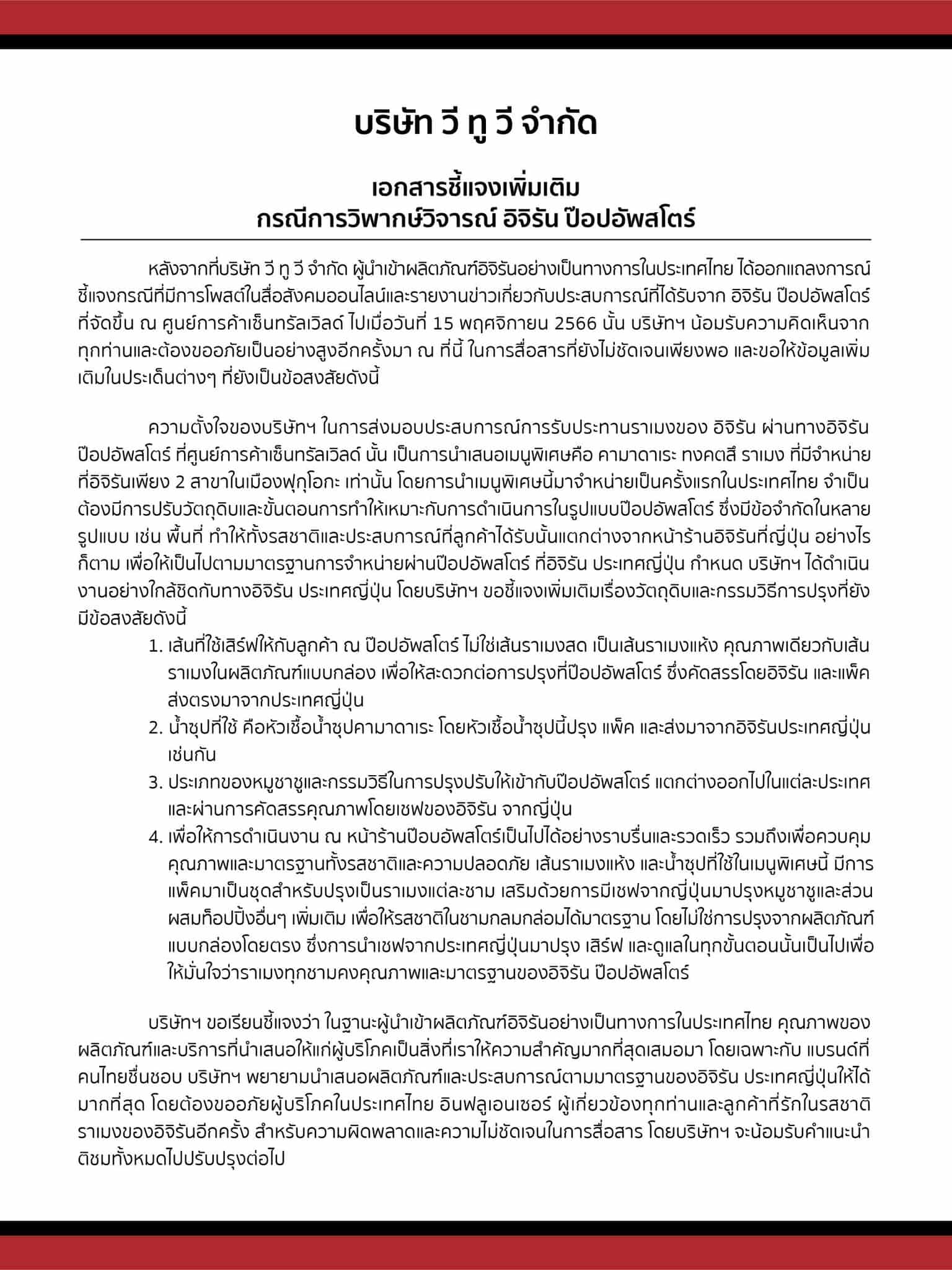 ขณะที่เอกสารที่ทางร้านโพสต์นั้นระบุว่า “หลังจากที่บริษัท วี ทู วี จํากัด ผู้นำเข้าผลิตภัณฑ์อิจิรันอย่างเป็นทางการในประเทศไทย ได้ออกแถลงการณ์ ชี้แจงกรณีที่มีการโพสต์ในสื่อสังคมออนไลน์และรายงานข่าวเกี่ยวกับประสบการณ์ที่ได้รับจาก อิจิรัน ป๊อปอัพสโตร์ ที่จัดขึ้น ณ ศูนย์การค้าเซ็นทรัลเวิลด์ ไปเมื่อวันที่ 15 พฤศจิกายน 2566 นั้น บริษัทฯ น้อมรับความคิดเห็นจาก ทุกท่านและต้องขออภัยเป็นอย่างสูงอีกครั้งมา ณ ที่นี้ ในการสื่อสารที่ยังไม่ชัดเจนเพียงพอ และขอให้ข้อมูลเพิ่ม เดิมในประเด็นต่างๆ ที่ยังเป็นข้อสงสัยดังนี้