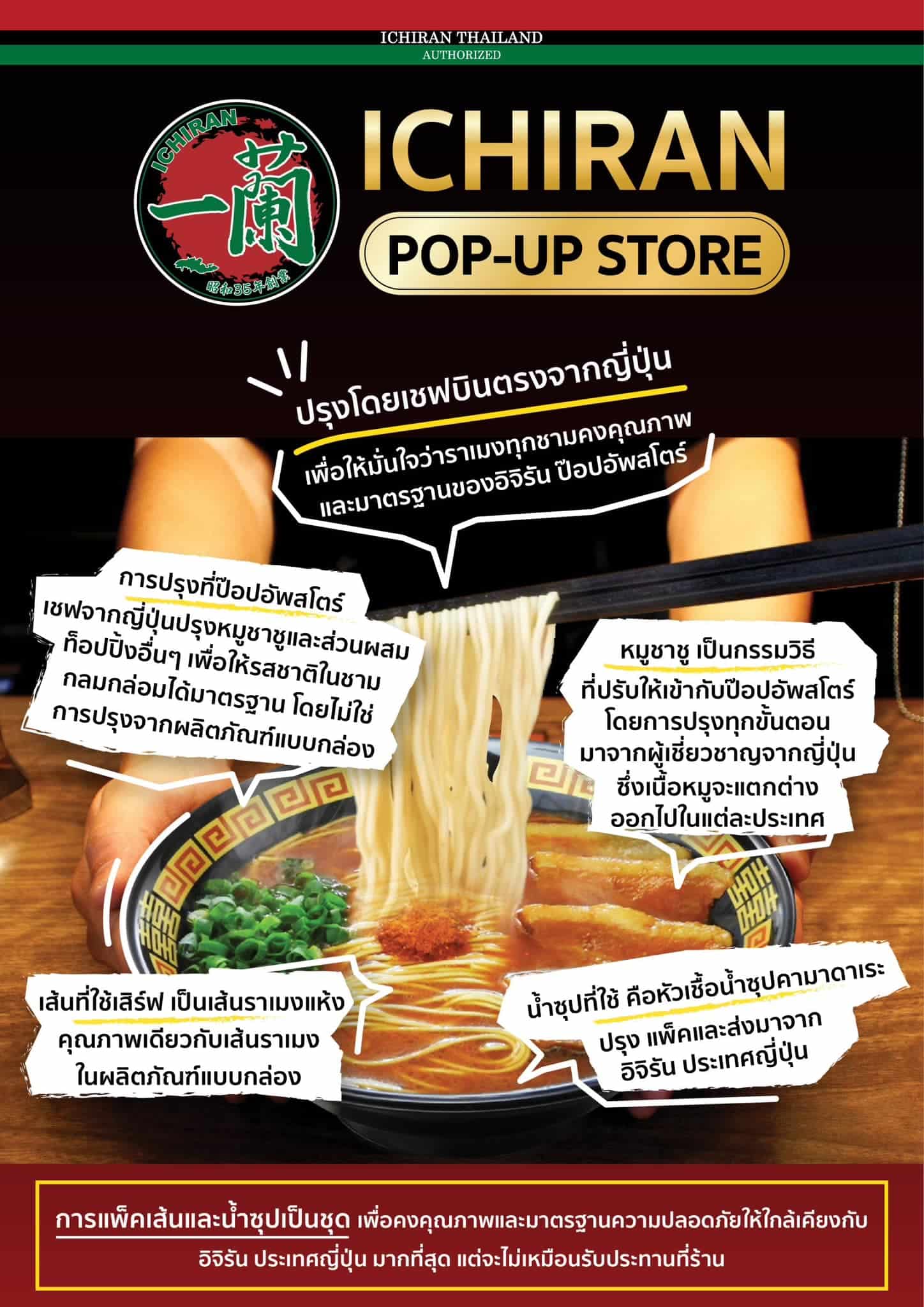 โดยไม่ใช่การปรุงจากผลิตภัณฑ์ แบบกล่องโดยตรง ซึ่งการทําเชฟจากประเทศญี่ปุ่นมาปรุง เสิร์ฟ และดูแลในทุกขั้นตอนนั้นเป็ไปเพื่อ ให้มั่นใจว่าราเมงทุกชามคงคุณภาพและมาตรฐานของอิจิรัน ป๊อปอัพสโตร์