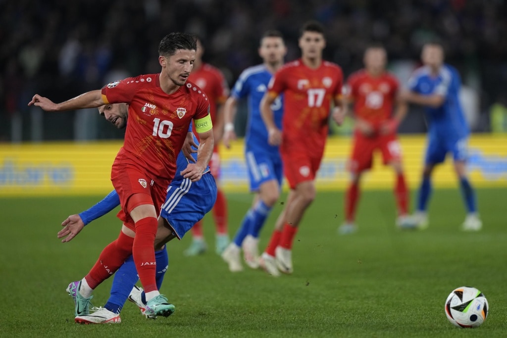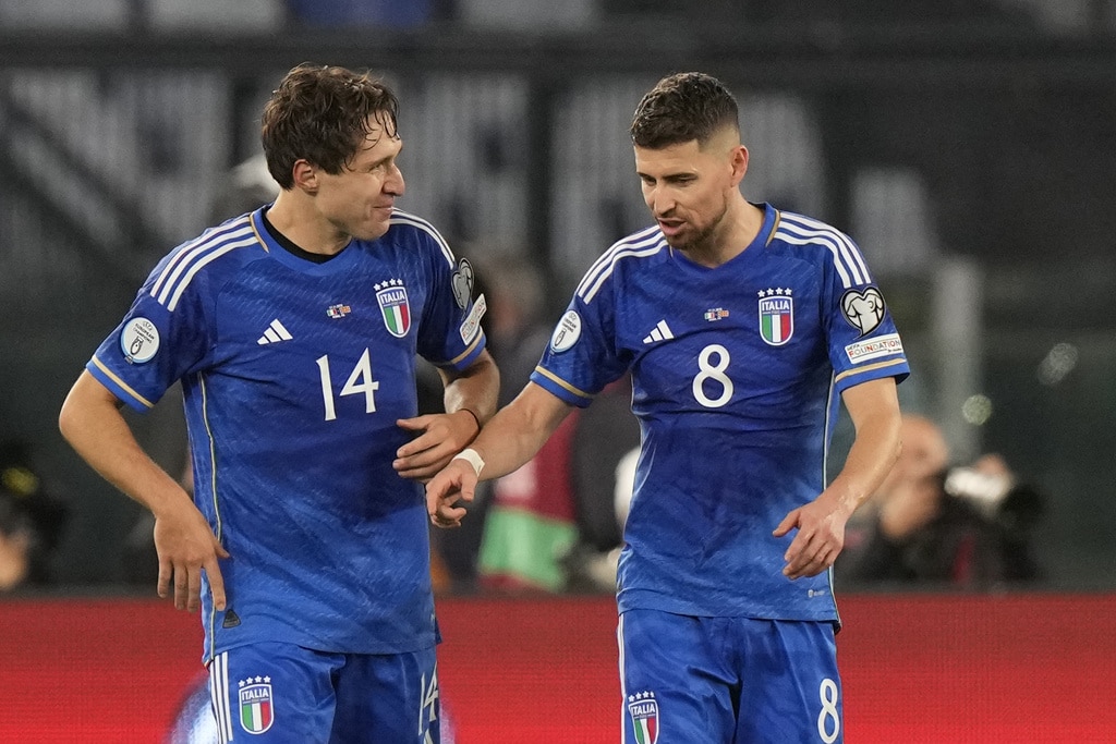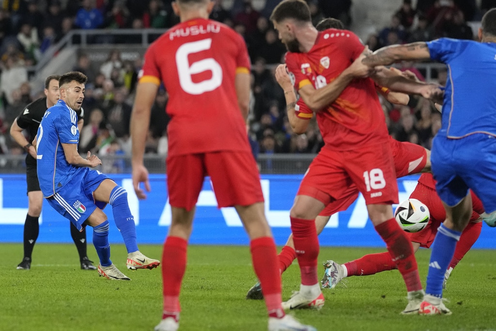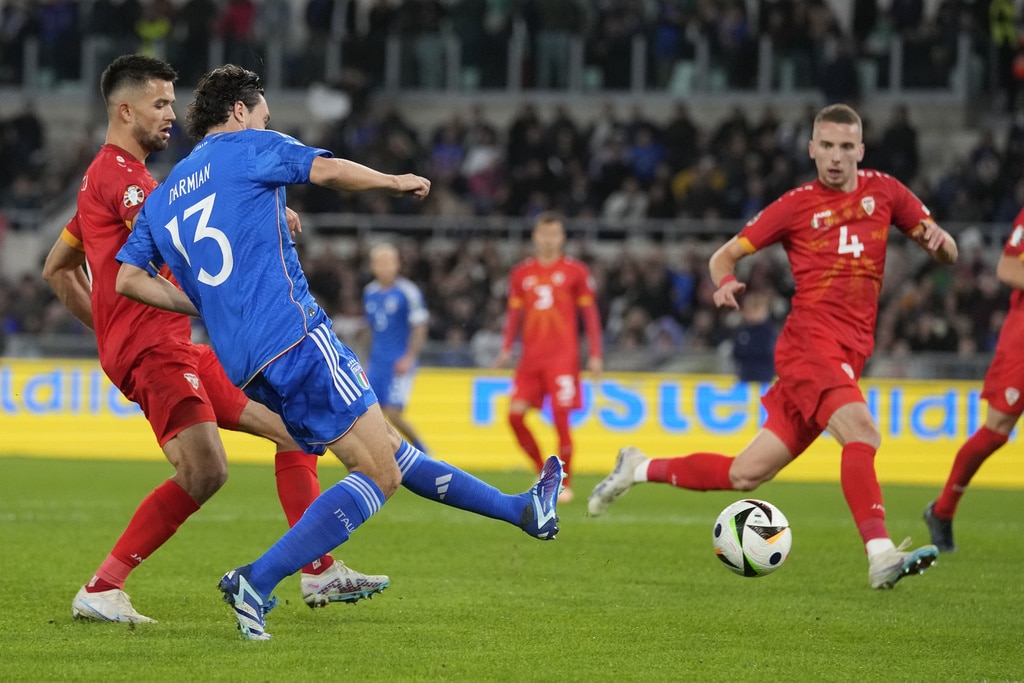Italy’s Bryan Cristante celebrates at the end of an Euro 2024 group C qualifying soccer match between Italy and North Macedonia, at the Olympic stadium, in Rome Friday, Nov. 17, 2023. (AP Photo/Andrew Medichini)Italy goalkeeper Gianluigi Donnarumma celebrates at the end of an Euro 2024 group C qualifying soccer match between Italy and North Macedonia, at the Olympic stadium, in Rome Friday, Nov. 17, 2023. (AP Photo/Andrew Medichini)Italy’s Giacomo Raspadori celebrates with his teammates after scoring his side’s fifth goal during an Euro 2024 group C qualifying soccer match between Italy and North Macedonia, at the Olympic stadium, in Rome Friday, Nov. 17, 2023. (AP Photo/Andrew Medichini)Italy’s Stephan El Shaarawy scores his side’s fifth goal during an Euro 2024 group C qualifying soccer match between Italy and North Macedonia, at the Olympic stadium, in Rome Friday, Nov. 17, 2023. (AP Photo/Andrew Medichini)Italy’s Stephan El Shaarawy scores his side’s fifth goal during an Euro 2024 group C qualifying soccer match between Italy and North Macedonia, at the Olympic stadium, in Rome Friday, Nov. 17, 2023. (AP Photo/Andrew Medichini)North Macedonia’s Yari Atanasov celebrates after scoring his sides second goal during an Euro 2024 group C qualifying soccer match between Italy and North Macedonia, at the Olympic Stadium stadium in Rome Friday, Nov. 17, 2023. (AP Photo/Andrew Medichini)Italy’s Domenico Berardi, left, challenges for the ball with North Macedonia’s Enid Bardhi during an Euro 2024 group C qualifying soccer match between Italy and North Macedonia, at the Olympic stadium, in Rome Friday, Nov. 17, 2023. (AP Photo/Andrew Medichini)Italy’s Giacomo Raspadori, left, challenges for the ball with North Macedonia’s Arijan Ademi during an Euro 2024 group C qualifying soccer match between Italy and North Macedonia, at the Olympic stadium, in Rome Friday, Nov. 17, 2023. (AP Photo/Andrew Medichini)Italy’s Matteo Darmian, left, challenges for the ball with North Macedonia’s Eljif Elmas during an Euro 2024 group C qualifying soccer match between Italy and North Macedonia, at the Olympic stadium, in Rome Friday, Nov. 17, 2023. (AP Photo/Andrew Medichini)Italy’s Matteo Darmian makes an attempt to score during an Euro 2024 group C qualifying soccer match between Italy and North Macedonia, at the Olympic stadium, in Rome Friday, Nov. 17, 2023. (AP Photo/Andrew Medichini)Italy’s Federico Chiesa celebrates after scoring his sides second goal during an Euro 2024 group C qualifying soccer match between Italy and North Macedonia, at the Olympic Stadium stadium in Rome Friday, Nov. 17, 2023. (AP Photo/Andrew Medichini)Italy’s Federico Chiesa, left, celebrates with his teammate Jorginho after scoring his sides second goal during an Euro 2024 group C qualifying soccer match between Italy and North Macedonia, at the Olympic Stadium stadium in Rome Friday, Nov. 17, 2023. (AP Photo/Andrew Medichini)
