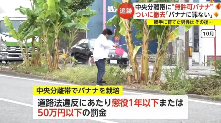โดยชายในช่วงอายุ 50 ปี ได้แอบลักลอบปลูกต้นกล้วยบริเวณเกาะกลางถนนมานาน 2 ปี โดยไม่มีใครสังเกต จนกระทั้งผู้ใช้ท้องถนนได้ร้องเรียนทางการว่าต้นกล้วยได้บดบังทัศนวิสัยในการขับขี่ ซึ่งเจ้าหน้าที่ก็สามารถตามตัวชายคนดังกล่าวได้ไม่ยาก เนื่องจากมีผู้พบเห็นชายในช่วงอายุ 50 ปีที่นี่เดินมารดน้ำต้นไม้วันละ 2 ครั้งทุกวัน โดยเจ้าหน้าที่สั่งให้เขาถอนต้นกล้วยนี้ออก มิเช่นนั้นเขาอาจจะต้องติดคุกหรือถูกปรับเงินราวๆ 117,000 บาท (500,000 เยน) ซึ่งท้ายที่สุดเขาก็ยอมถอนต้นกล้วยออก