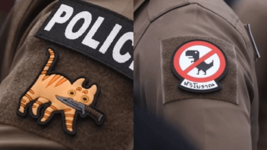 ตำรวจแจง ตำรวจติดอาร์มไดโนเสาร์ – แมวส้ม มีผู้ชุมนุมเอามาแปะ