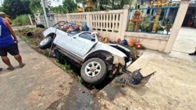 ปู่นิ้วล็อก ควบคุมพวงมาลัยไม่ได้ พุ่งตกร่องน้ำข้างทาง รถพังยับเยิน