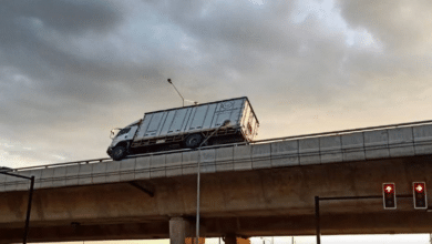 หวาดเสียว รถบรรทุกไต่ราวสะพาน ยกระดับสี่แยกนาก่วม หวั่นตกลงมาข้างล่าง