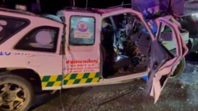 กู้ภัยนำของบริจาคช่วยน้ำท่วมสุโขทัย ชนท้ายรถพ่วง ดับ 1 สาหัส 2