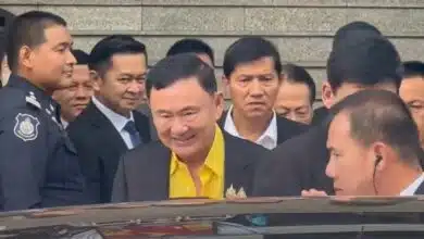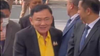 ‘ทักษิณ’ มาถึงศาลแล้ว ใส่เสื้อเหลือง ยืนยันไม่กังวล พร้อมสู้คดี ม.112