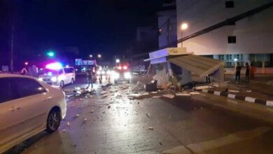 แรงทะลุป้อม! เก๋งหลุดโค้งพุ่งชนป้อมตำรวจพังยับ โชคดีไม่มีเจ้าหน้าที่อยู่ในป้อม