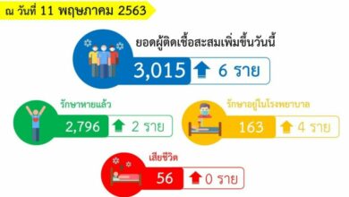 โควิด-19 11 พฤษภาคม ไทยติดเชื้อเพิ่ม 6 ราย ไม่พบผู้เสียชีวิต