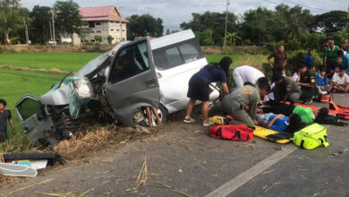 รถตู้บรรทุกนักเรียน 18 คน ยางแตกจนพุ่งชนเสาไฟ เจ็บระนาว