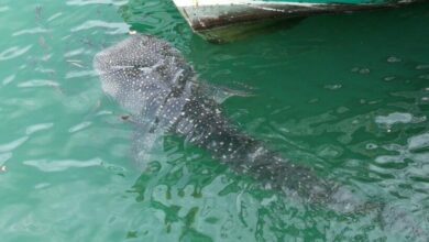 โผล่น้ำตื้น! ‘น้องจุด’ ฉลามวาฬว่ายโชว์ริมท่าเรือประจวบฯ
