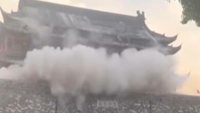 เปิดคลิปวินาทีระทึก หลังคาหอคอยราชวงศ์หมิงถล่ม นักท่องเที่ยวหนีตาย
