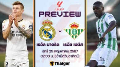25 พฤษภาคม 2567 เวลา 02.00 น. ถ่ายทอดสด เรอัล มาดริด พบ เรอัล เบติส ฟุตบอล ลาลีกา 2023/24 นัดที่ 38 The Thaiger พาไปวิเคราะห์ก่อนเกม และการคาดการณ์ 11 ตัวจริง พร้อมลิงก์ดูบอลออนไลน์ ดูบอลสด ได้ทางลิง