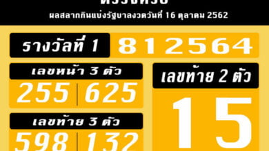 ตรวจหวย 16/10/62 รางวัลที่ 1 เลขท้าย 2 ตัว 3 ตัว เลขหน้า 3 ตัว และรางวัลอื่น ๆ