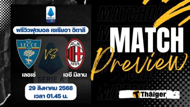 29 สิงหาคม 2568 เวลา 01.45 น. ถ่ายทอดสด ดูบอลสด ฟุตบอล กัลโช่ เซเรียอา อิตาลี ฤดูกาล 2025/26 ที่สนาม สตาดิโอ เวีย เดล มาเร เลชเช่ พบ เอซี มิลาน The Thaiger พาไปวิเคราะห์เกม พร้อมการทำนายผล และคาดการณ์