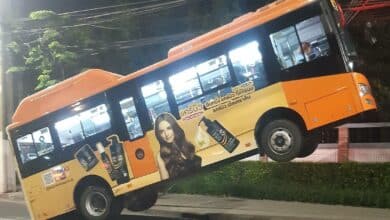 รถเมล์ลื่นน้ำมัน เสียหลักเสยสลิงยึดเสาไฟ ยกล้อค้างไปไหนไม่ได้