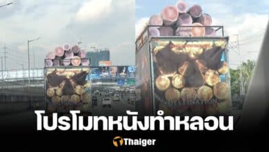 ทำถึงเกิน หนังดังปิดแบนเนอร์ท่อนซุงท้ายรถบรรทุก ทำคนขับรถตามหลอน กลัวตายเหมือนในหนัง